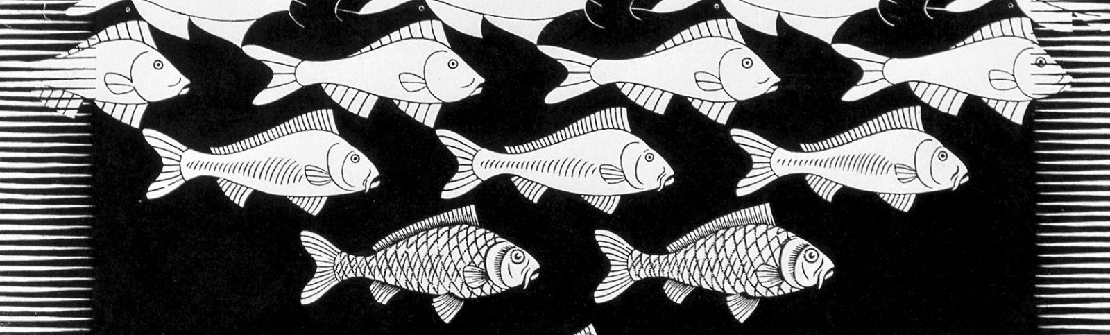 “Let me now show you two attempts to symbolize the idea of boundlessness. To the left is shown a fragment of a plane, which could be filled endlessly with similar fish figures. The simplest way to eliminate the fragmentary aspect of such an image is to take a sphere instead of a flat piece of paper and to divide its curved surface into a limited number of these figures. …. When you turn this ball in your hands, fish after fish appears in endless succession. Though their number is restricted, they symbolize the idea of boundlessness in a manner that is not obtainable on a plane.”**