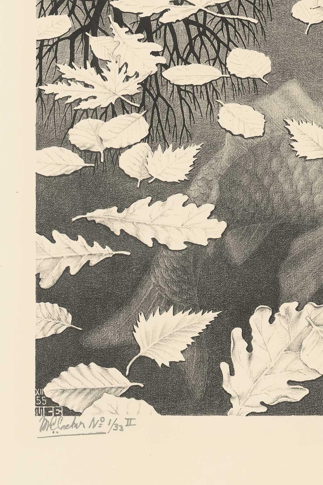 The print is the result of one of the many walks Escher took in the woods around his home town of Baarn. He enjoyed the silence and the beauty of nature. He believed that silence and beauty were best illustrated by the puddles and pools he passed during his walks. Only when it is really still does the water surface reflect nature in perfect symmetry. Water has the unique property of being simultaneously transparent and reflective.* Three Worlds is the last of three prints in which the world is reflected in water. The other two are Rippled Surface and Puddle. The reflective water surfaces he saw during his walks are echoed by the many other mirrors in his oeuvre. Flat mirrors, convex mirrors, mirrors in which he himself can be seen, mirrors that show a street or the sky, mirrors that reflect reality and mirrors that seem like passages to another world. The reflective surface in Three Worlds ostensibly shows nothing more than reality. Yet it is a reality that consists of three worlds. A world above the water (the three trees), a world on the water (the leaves) and a world in the water (the fish).**