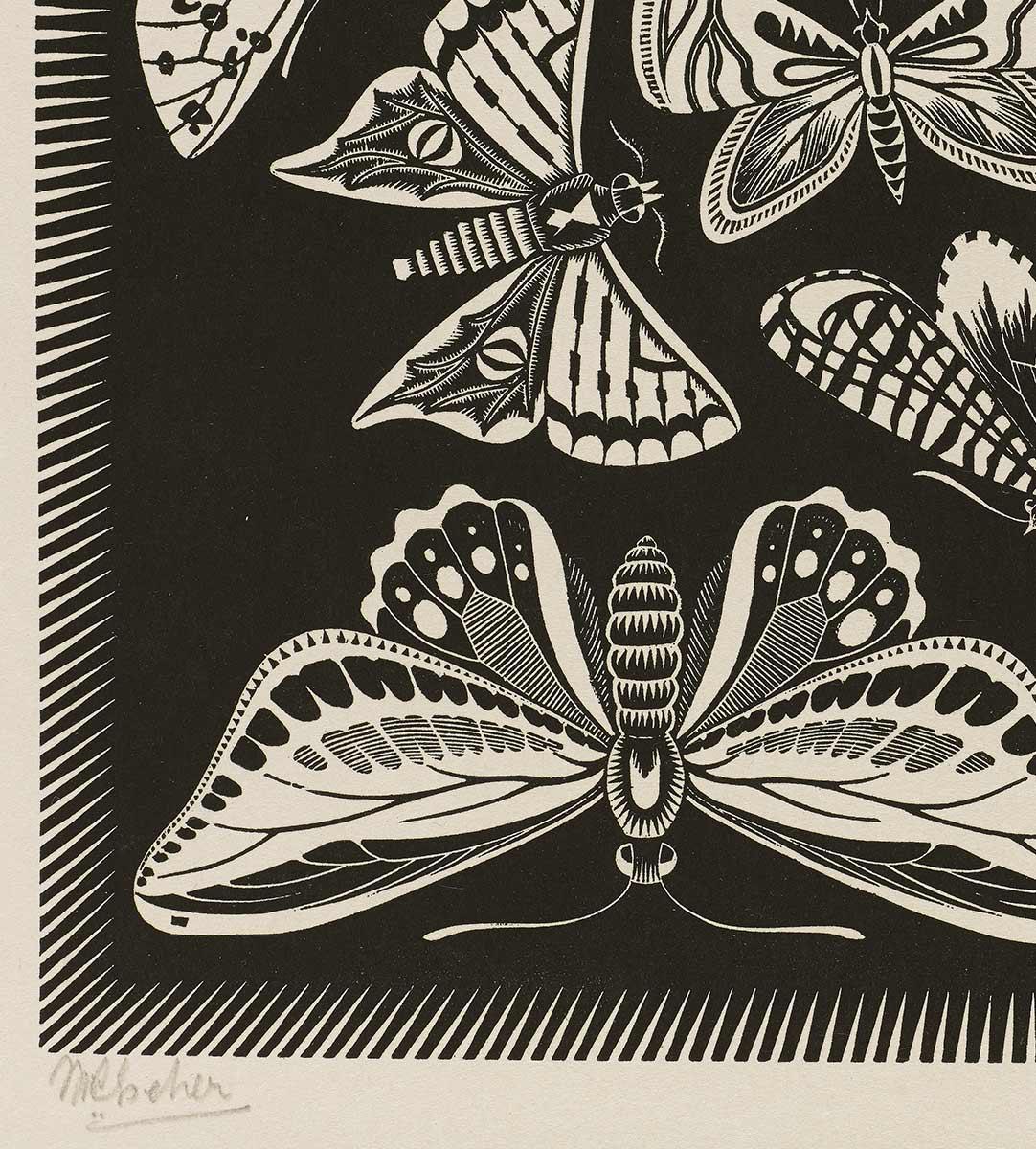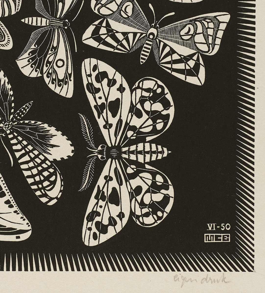Nevertheless, he had already effected a combination of transformation and convergence in the aforementioned pieces. In Butterflies, Escher endeavoured to infuse the print with character by having the butterflies all differ from each other. He had done this before in the woodcut Sun and Moon (1948), a tessellation of birds that are all different.