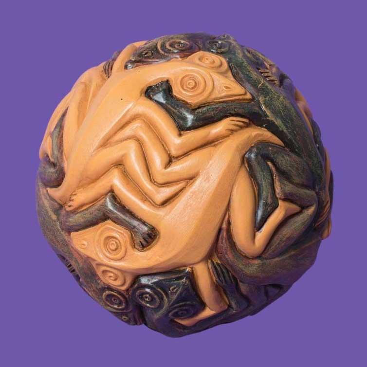 The sphere measures 14 centimeters in diameter. The rich oeuvre of graphic artist M.C. Escher features only three of them: one with fish, one with human figures and one with lizards (see photo). It is a magnificent object, but definitely not one intended to be used as a stress ball.