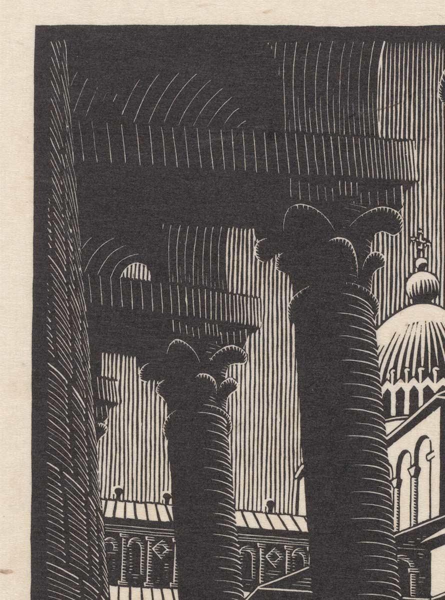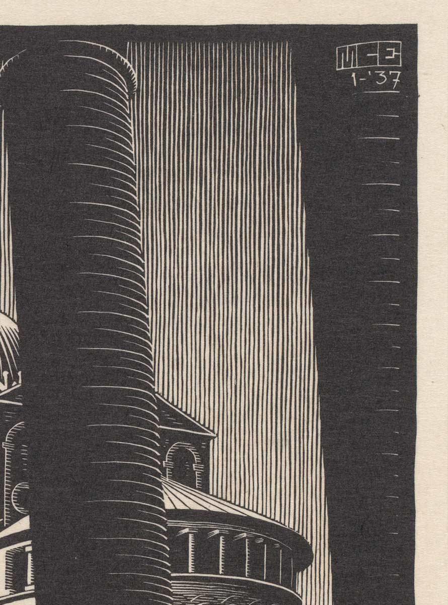 In the autumn Escher started turning his drawings into prints. He produced woodcuts of Venice and Ancona and the freighter on which he travelled, he produced wood engravings of Catania and Marseille, and he produced a lithograph of Nunziata in Sicily. In January 1937 he made a woodcut of the famous Leaning Tower. The campanile is usually shown from the outside, but his ascent to the first gallery provided Escher with an interesting viewpoint. The leaning columns of the tower contrast nicely with the straight ones of the Duomo.