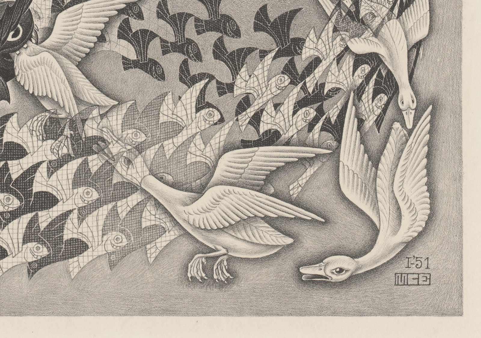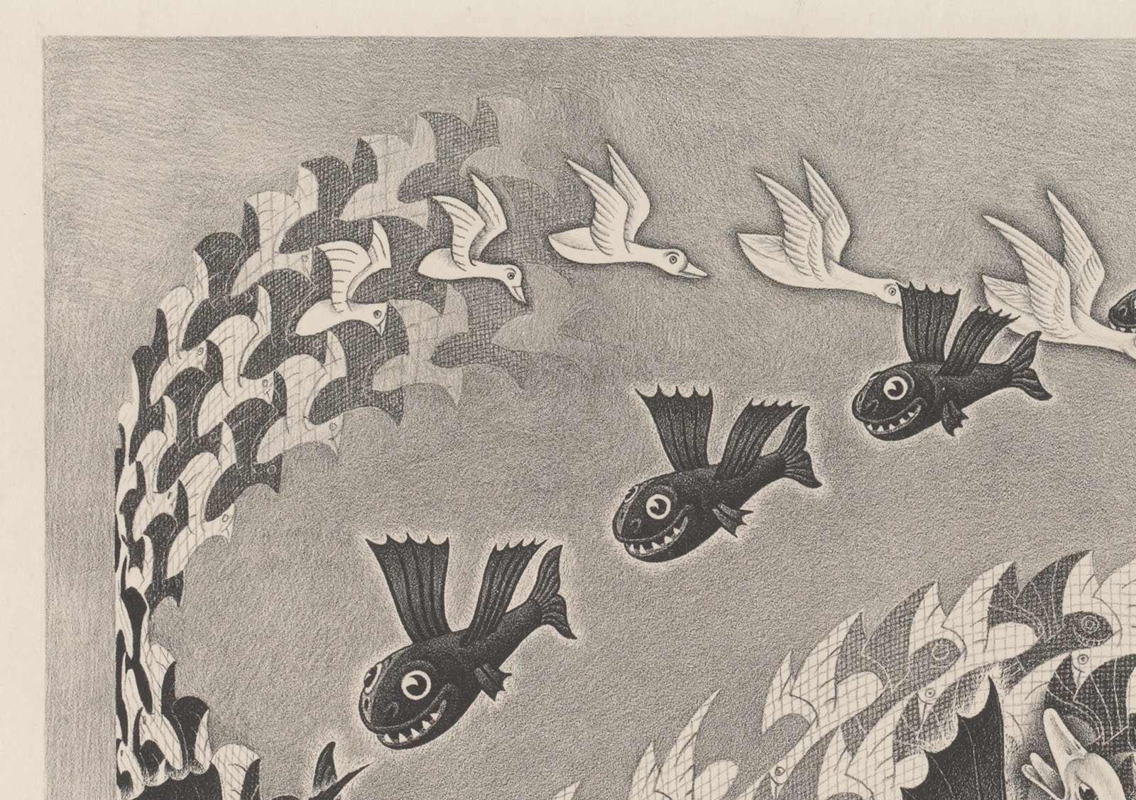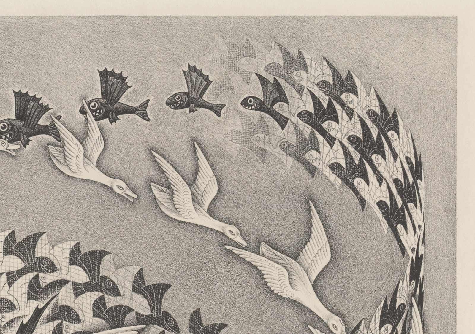 Giving life to shapes in a two-dimensional tessellation so as to produce three-dimensional, walking, flying and swimming creatures is something that Escher did often in his career. He was fascinated by the suggestive possibilities that the flat surface offers to deceive the eye. He explored this in such works as the prints Reptiles and Magic Mirror. Because the birds and fish meet in the middle, the print is also reminiscent of the Möbius bands he would create many years later. Lastly, there are similarities with two symbols for infinity; the lemniscate and the Ouroboros. The latter is a snake or dragon that bites its own tail and thus forms an eternal circle. These symbols can be linked to more Escher prints, but due to the fish that bites into the bird, the ouroboros features even more prominently here.
