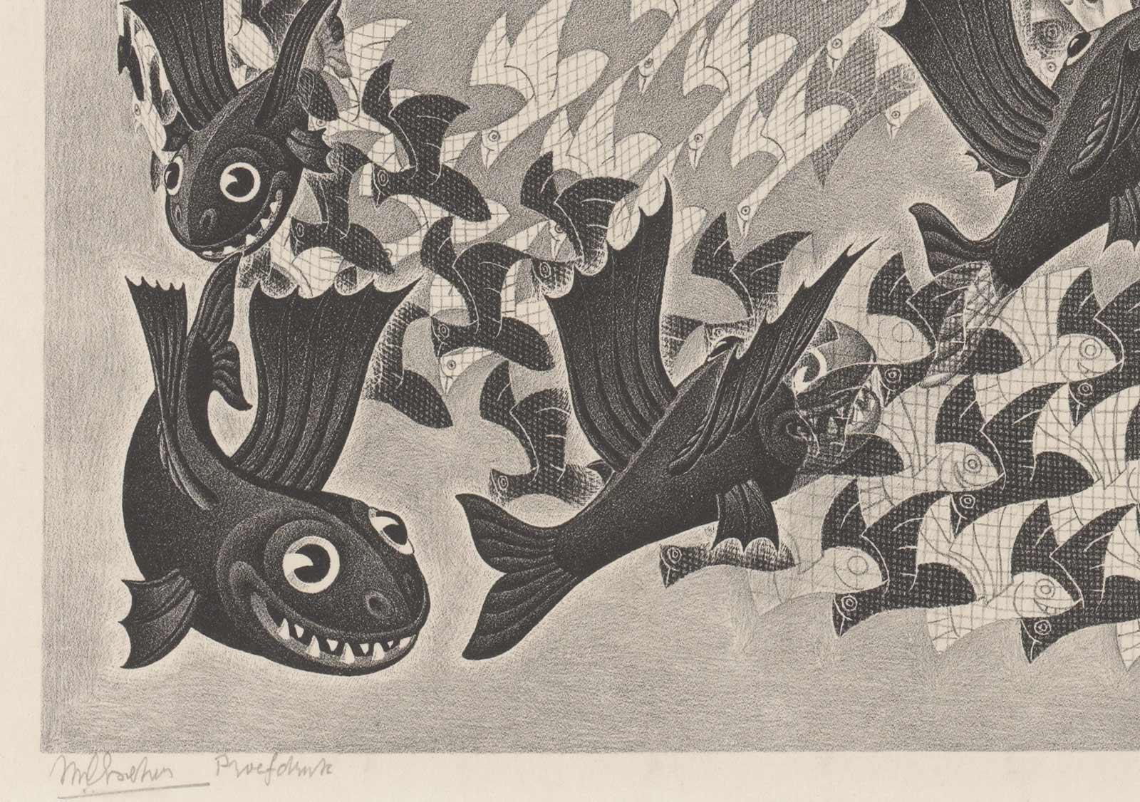 It is therefore quite remarkable that a print exists in which unrest prevails, focusing more on war than on peace. At the tail end of 1950, Escher worked on the lithograph Predestination, which he initially called Topsy-Turvy World. In it, birds and predatory fish attack each other. He described the print himself as follows: