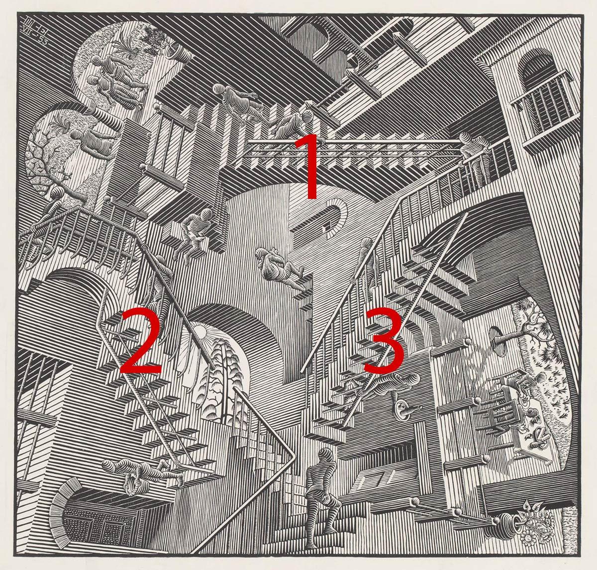 In the figure above, I have assigned a number to the three worlds. Escher very cleverly toys with our perceptions. He uses a staircase as the connecting element, in which the undersides have not been cut away. The staircase is connected to the outside world, the world outside the print, through pseudo-Romanesque passageways. By cunningly bringing together architectural elements with which we are all familiar, Escher prompts us to unquestioningly accept the impossible constructions of these prints. Presumably, we do not even notice them at first.