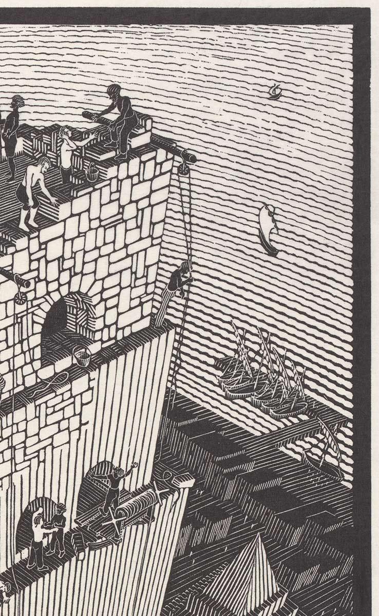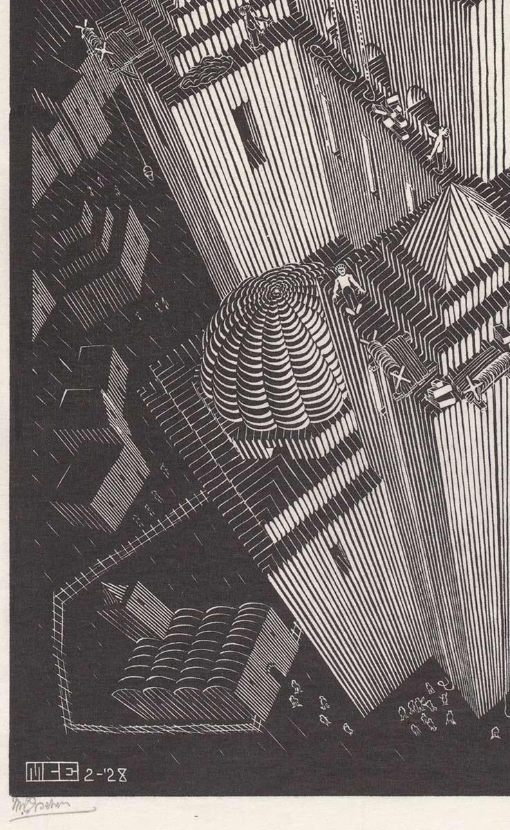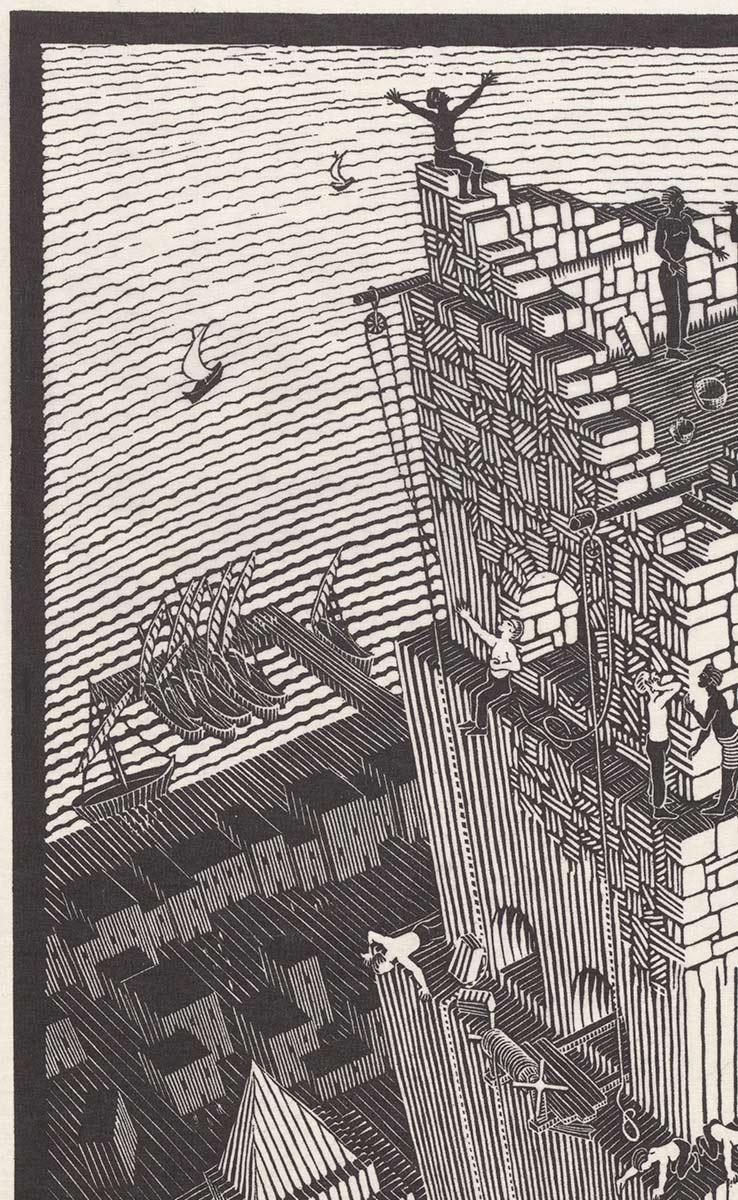 When Escher wrote an analysis about the woodcut Tower of Babel in 1959, his first sentence immediately referred to the confusion of tongues. Escher's preference for this form of disorder comes as no great surprise. A large, impossible building that causes confusion: this sounds like the ideal subject for the printmaker. In later prints such as Waterfall (1961), Belvedere (1958) and Relativity (1953), the amazement at the impracticability of structures that Escher himself devised is key. By then, the artist was much further along in his artistic development, and he had already been approaching architecture with a healthy dose of imagination for many years. In his younger years, Escher briefly studied architecture at the insistence of his parents. Although this did not turn out to be a great success for him, his fascination with the creation of buildings continues to recur in his work, albeit with more imagination than during his studies. He reflects on his student days in an interview in 1968: