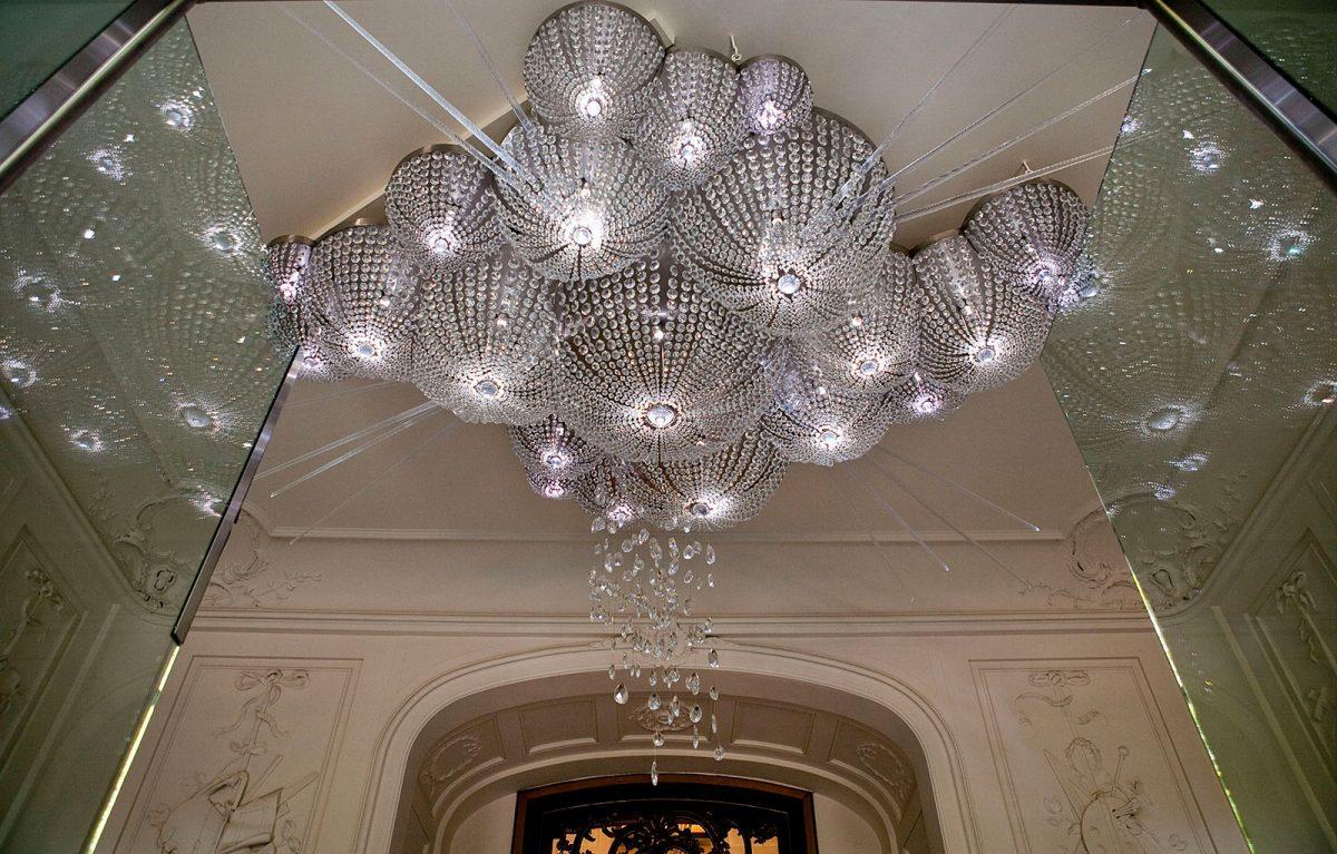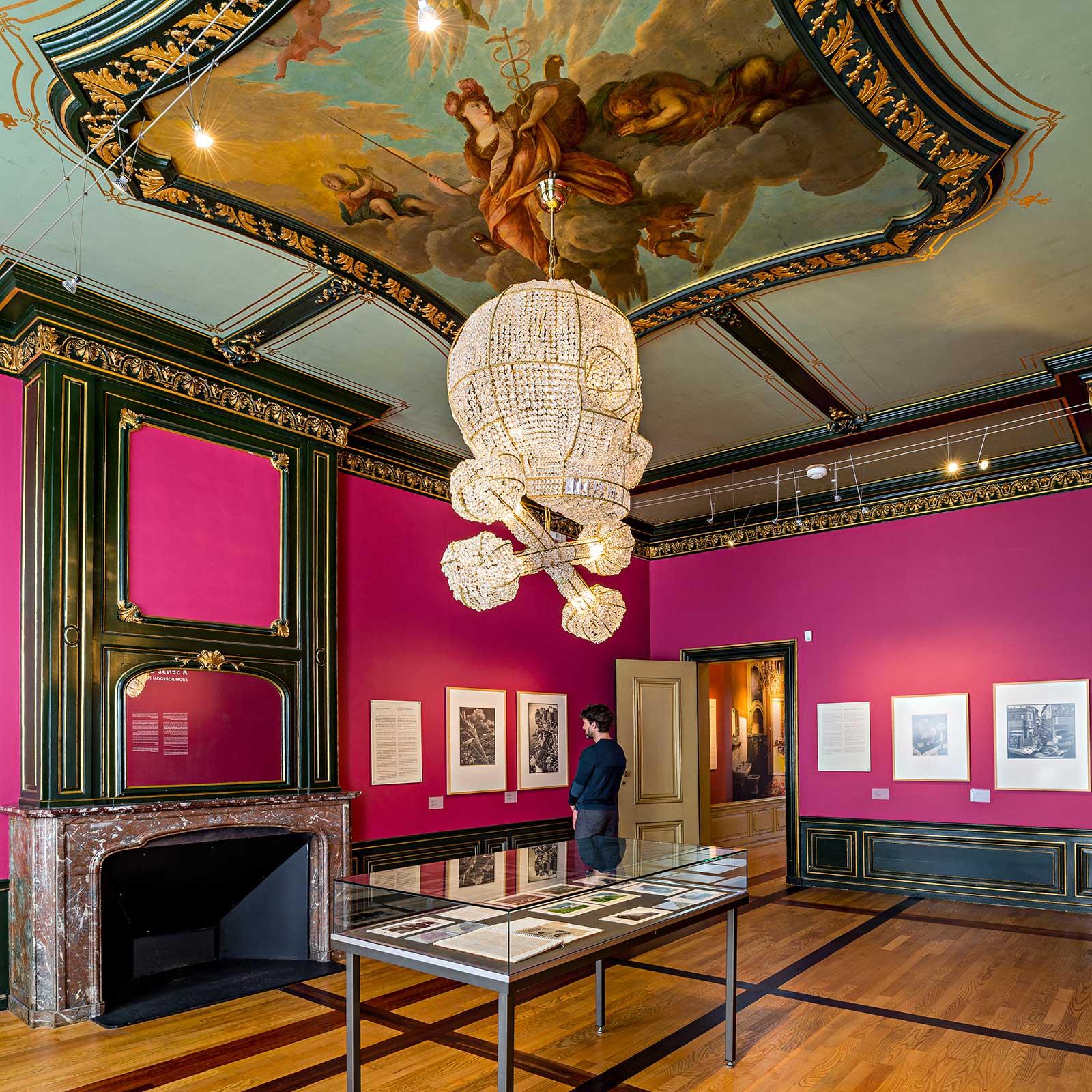 Dutch sculptor Hans van Bentem designed for the former Royal rooms on the ground and first floor very special chandeliers like a skull, a spider and an umbrella. The objects from the big chandelier in the central hall, the globe, the pair of compasses and the bow are all taken from the white wall decorations in the entrance hall. The light objects in the ground and first floor are one big work of art.