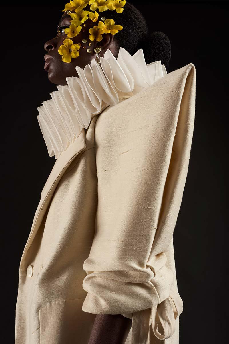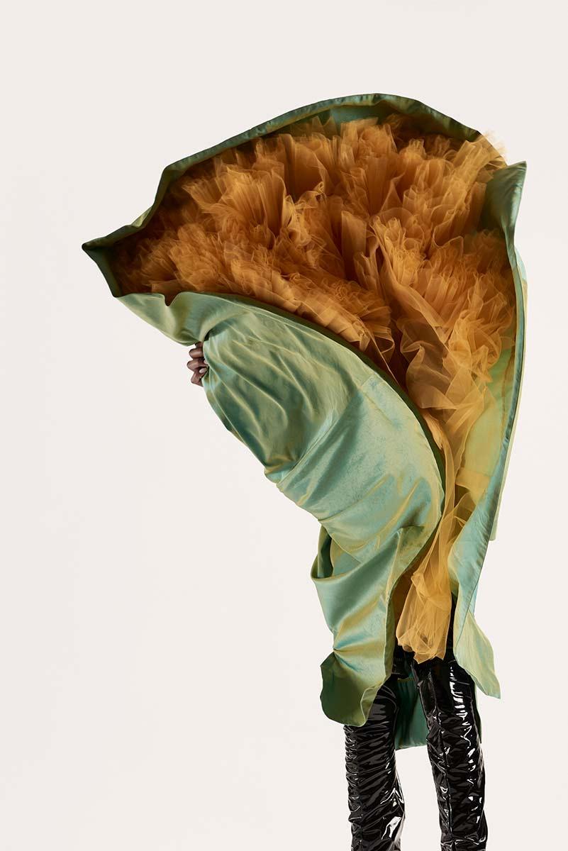 The work of Winklaar (1983, Willemstad) is characterised by feminine forms, a mix of textures and the use of crafts. Within the collection being exhibited, this is reflected in the use of spiral ribbing, high-quality embroidery and hand-painted flowers. Sustainability is also important to him—he likes to use what are deemed leftover materials from the textile industry. Winklaar draws inspiration for his garments from both the Dutch fashion scene and the colourful culture and nature of Curaçao.