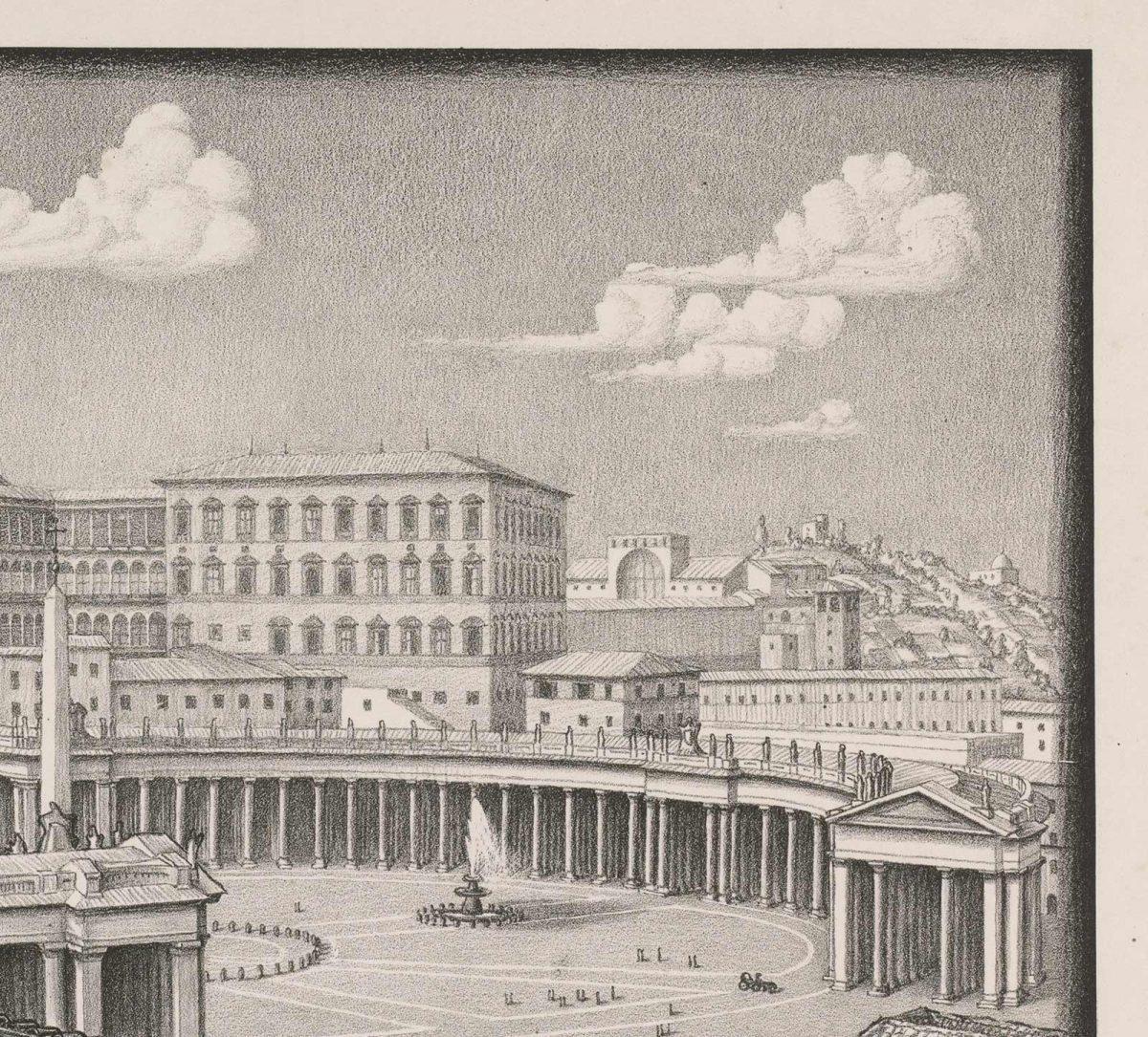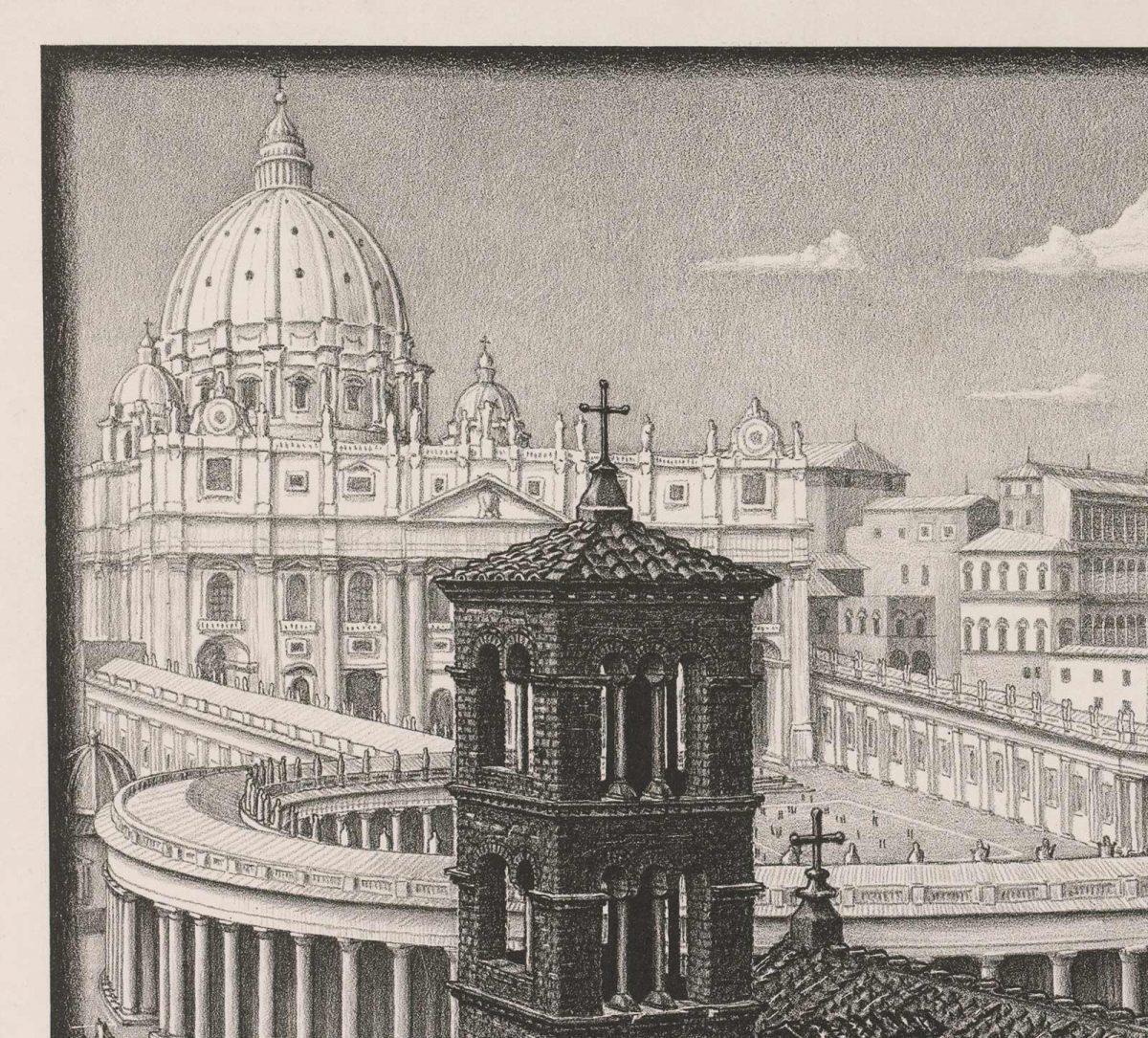 In June 1932, Escher was commissioned by the Dutch Historical Institute in Rome. The institute wanted to devote attention to a church whose visibility was threatened by the emerging new building sites in the capital. In the lithograph that Escher produced of San Michele dei Frisoni (the Frisian Church), he allows himself a considerable degree of artistic licence. He does not depict the current version of the church (built in 1141). Instead he portrayed the original version, which was destroyed by the Normans in 1084 during the Investiture Controversy. This controversy is known as the conflict between the Holy Roman Emperor Henry IV and the then pope Gregory VII.