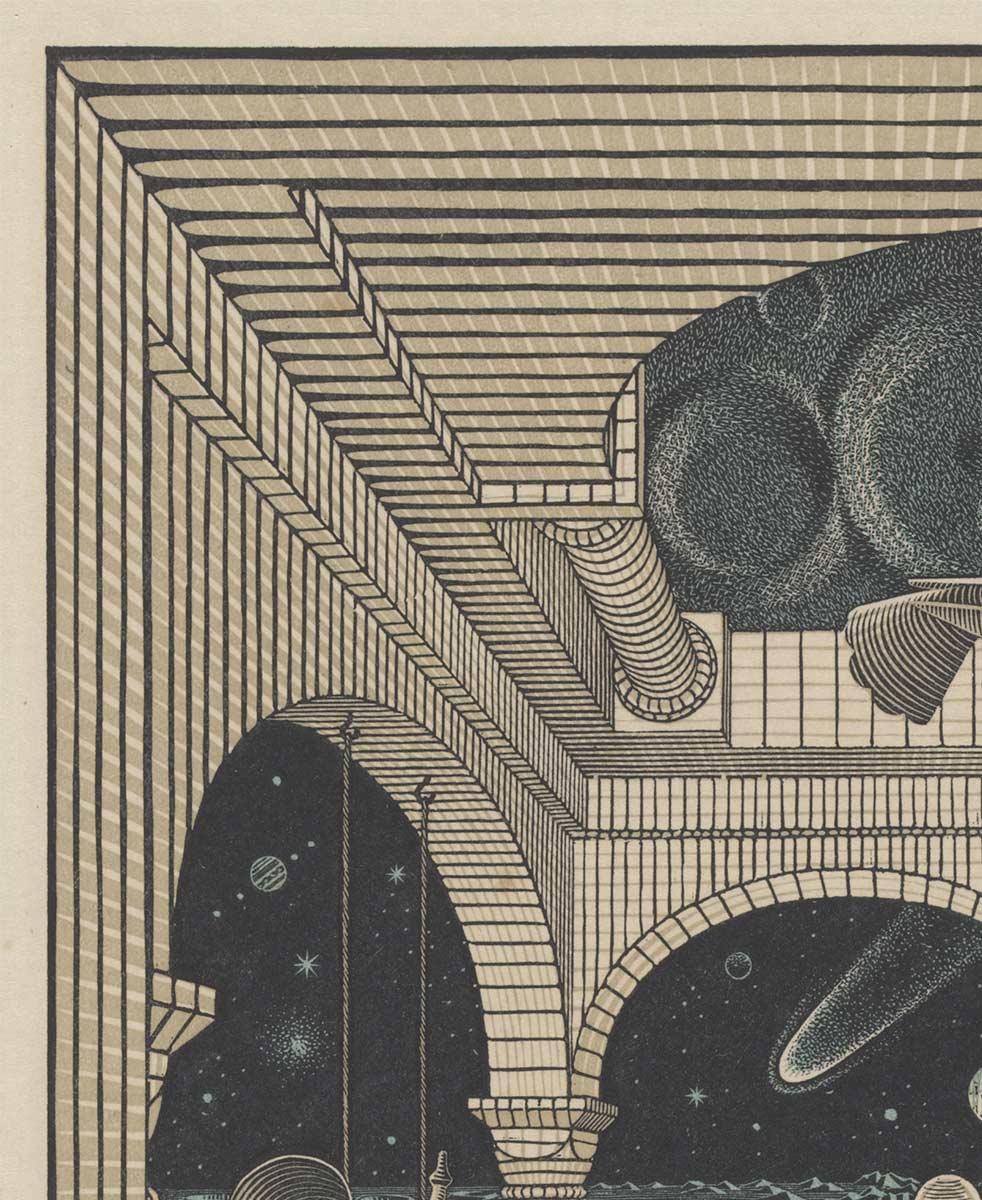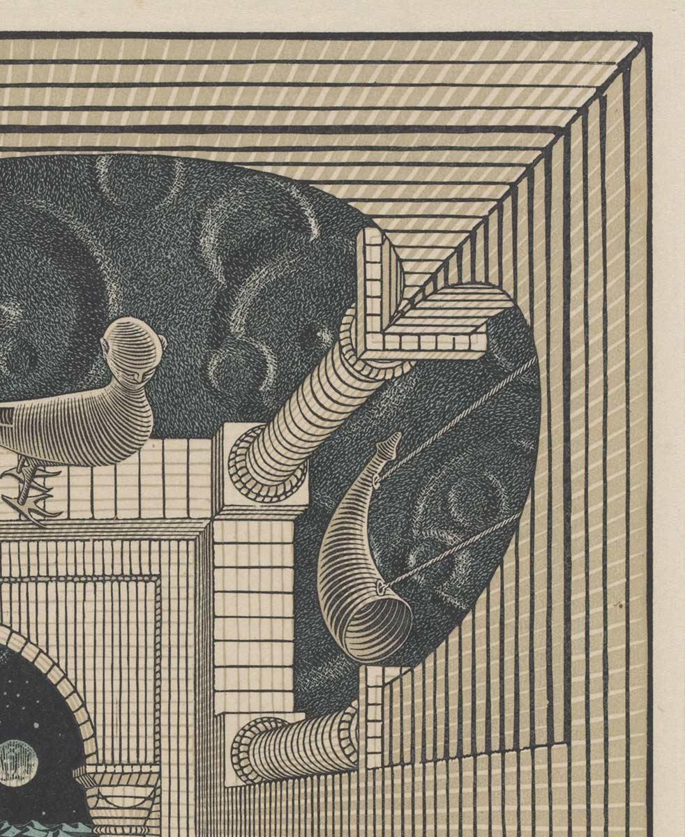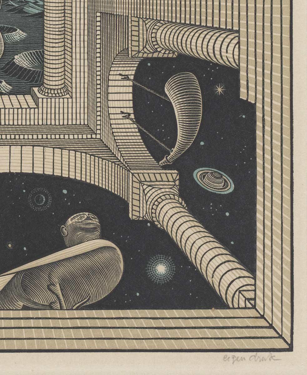 De duizelingwekkende prent Andere wereld hoort bij de topstukken van M.C. Escher. En dat is niet voor niets. Hij maakte deze combi van houtsnede en houtgravure in januari 1947. Het is alsof je door de ramen van een zwevend bakstenen kamertje naar een met kraters gevuld maanlandschap kijkt. Dat is op zichzelf al bijzonder genoeg, maar wat dit werk echt indrukwekkend maakt, is dat Escher drie blikken (nadir, horizon en zenith) op die maan in één beeld verenigt.