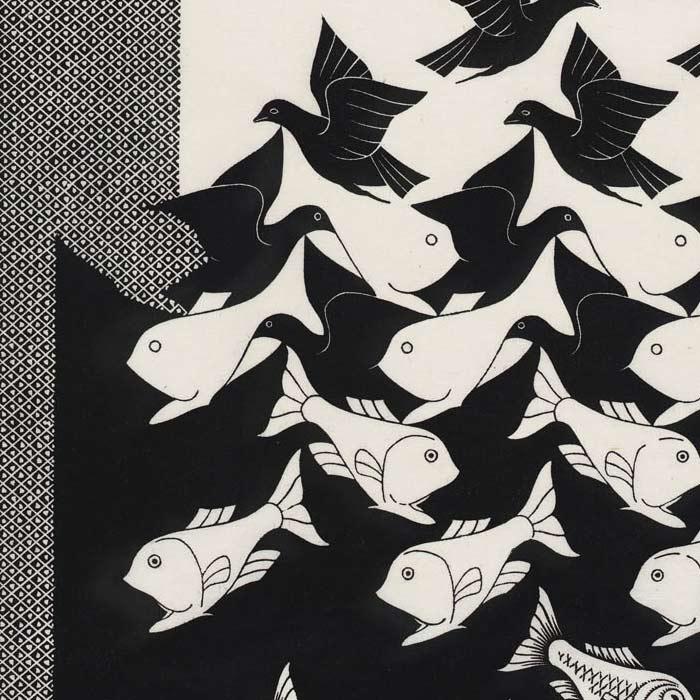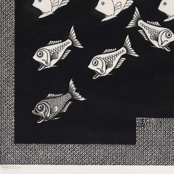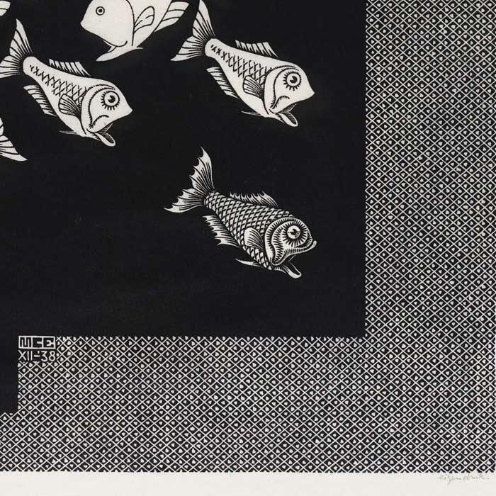 Omdat de bovenste helft in de onderste doorloopt en vice versa, ontstaat de vlakvulling waarbij de vogels restvorm worden bij de vissen en andersom. In opwaartse richting vanuit het midden openen zich de witte motieven en verliezen ze langzaam hun visvormige silhouetten; ze vloeien in elkaar over en veranderen in een achtergrond van witte lucht waarin de vogels vliegen. Het tegengestelde gebeurt als je vanuit het midden het oog in neerwaartse richting begeeft. Door die afwisseling van vorm en restvorm is het moeilijk vast te stellen hoeveel vogels en vissen er in deze houtsnede zitten. Is een vogel als restvorm ook een vogel en zo ja, op welk moment stopt dat dan? Hoewel het op schrift veel ingewikkelder lijkt dan het bekijken van de prent, is juist dat kijken ook heel moeilijk. Escher fopt je waar je bij staat. Telkens weer.