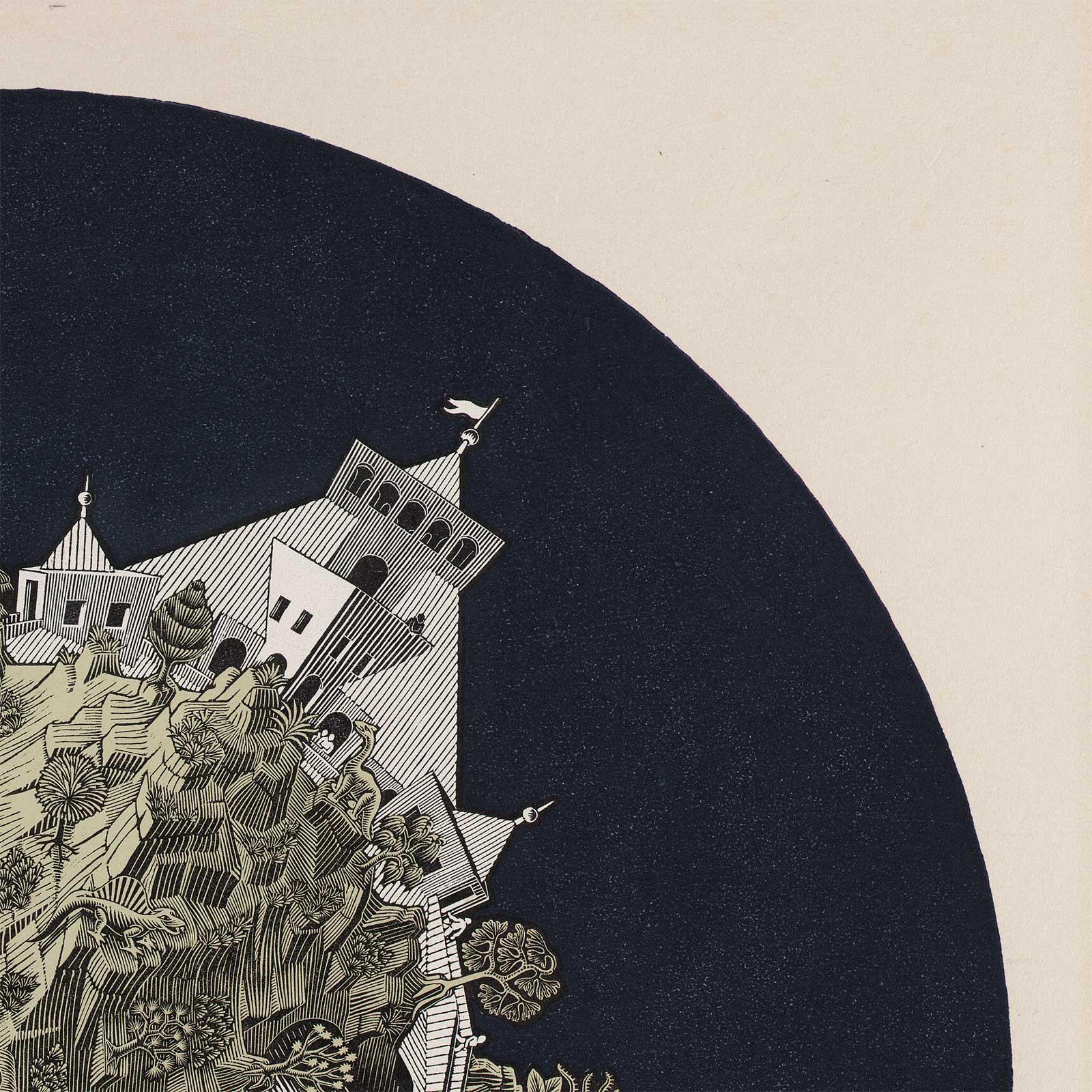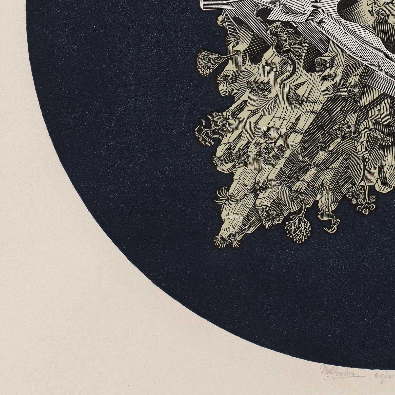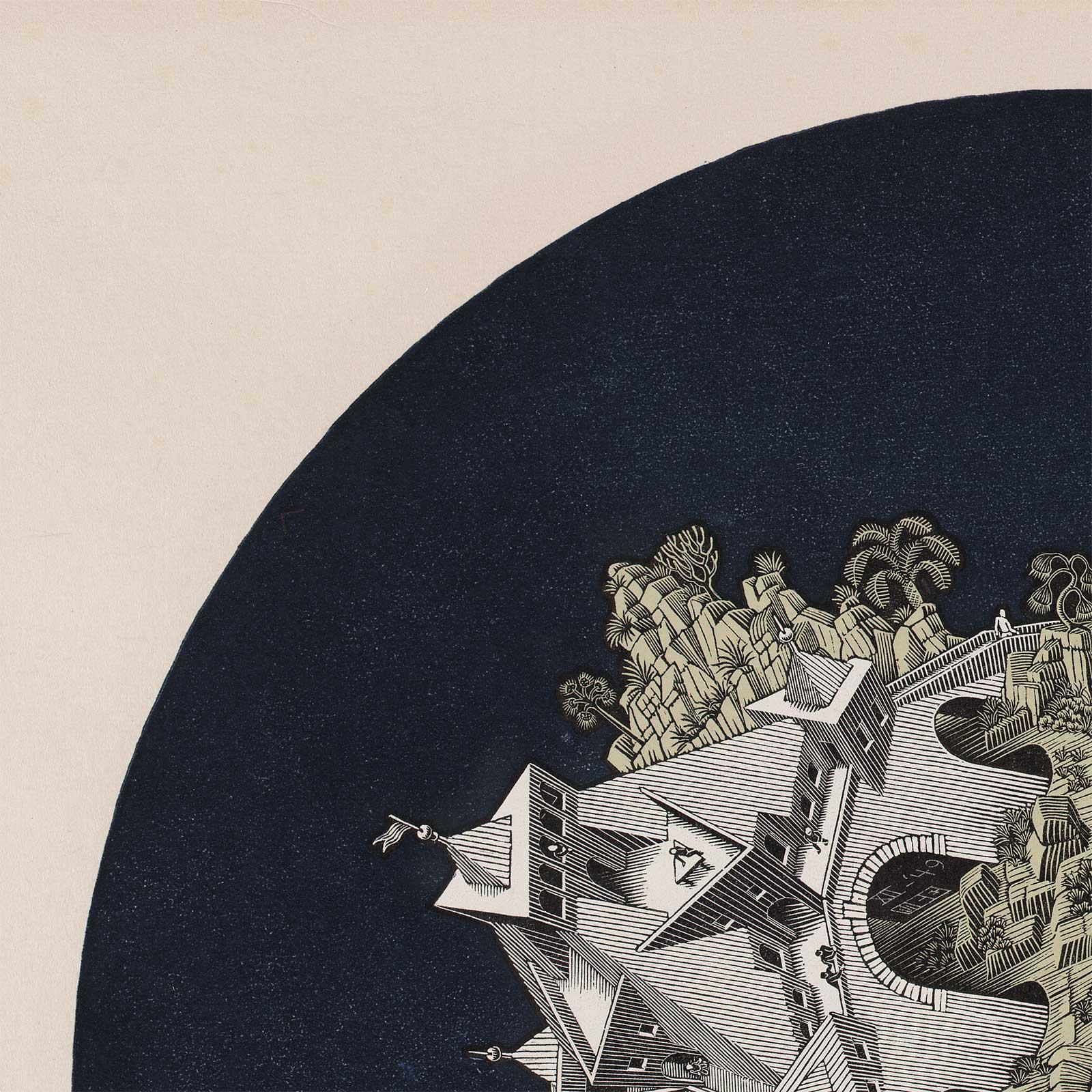 Twee prachtige werken waarin Escher een complete buitenaardse beschaving weet te scheppen. Met deze sciencefictionwerelden onderzoekt hij hoe hij verschillende zwaartekrachten of perspectieven op een visueel geloofwaardige manier met elkaar kan verbinden. Door die zwaartekrachten in een buitenaardse omgeving te plaatsen, lijkt dit logischer, makkelijker voorstelbaar.