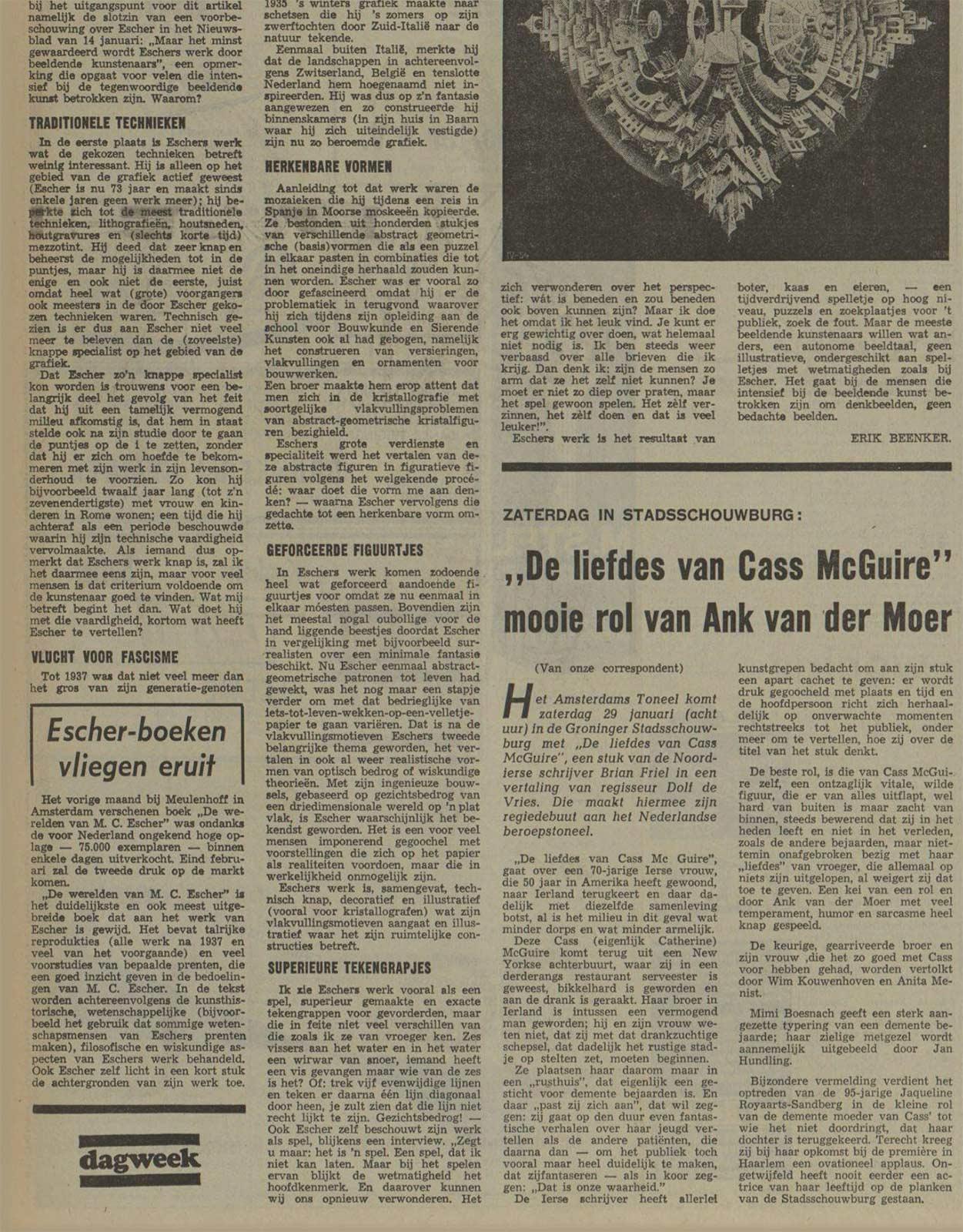 Aanvankelijk denk je dat dit een prijzend stuk wordt. De koppen zijn heel positief en de auteur begint met de constatering dat de kunstenaar bij het publiek steeds populairder wordt. De aanleiding voor het artikel is een tentoonstelling van Escher in Pictura in Groningen maar op hetzelfde moment is er ook een tentoonstelling in Boijmans van Beuningen in Rotterdam. 'Op verzoek van vele bezoekers van het Museum.' De auteur vermoedt dat Boijmans het anders nooit gedaan zou hebben. Vervolgens begint hij de kunstenaar stelselmatig af te breken, gebruikmakend van woorden als 'weinig interessant', 'traditioneel', 'oubollig', 'geforceerd', 'gegoochel', 'spelletje' en 'het resultaat van boter, kaas en eieren.'