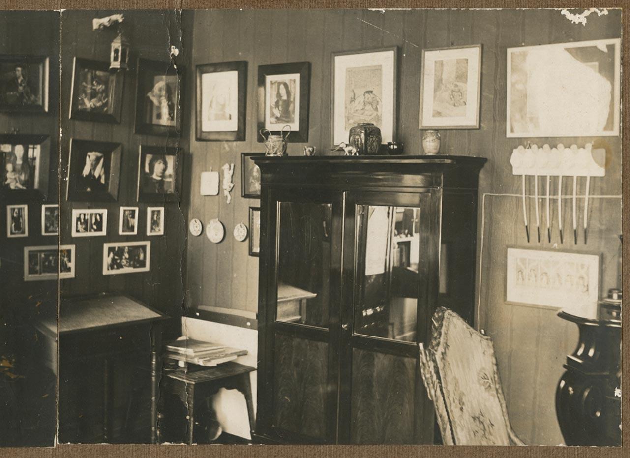 Ook Escher had zijn eigen kunstkamer. Op microniveau, dat wel, maar toch. Op zeer jonge leeftijd verzamelde hij artefacten en reproducties van werken die hij mooi of inspirerend vond en hing die met veel zorg op in zijn eigen vertrek. Het mooie is, dat er nog een foto bewaard is van die kamer, gemaakt in 1915 toen hij in Arnhem woonde. De kamer is een moodboard avant la lettre, een analoge Pinterest. Een enthousiaste verzameling van alles wat Escher fascineerde, bewonderde en inspireerde op 17-jarige leeftijd.