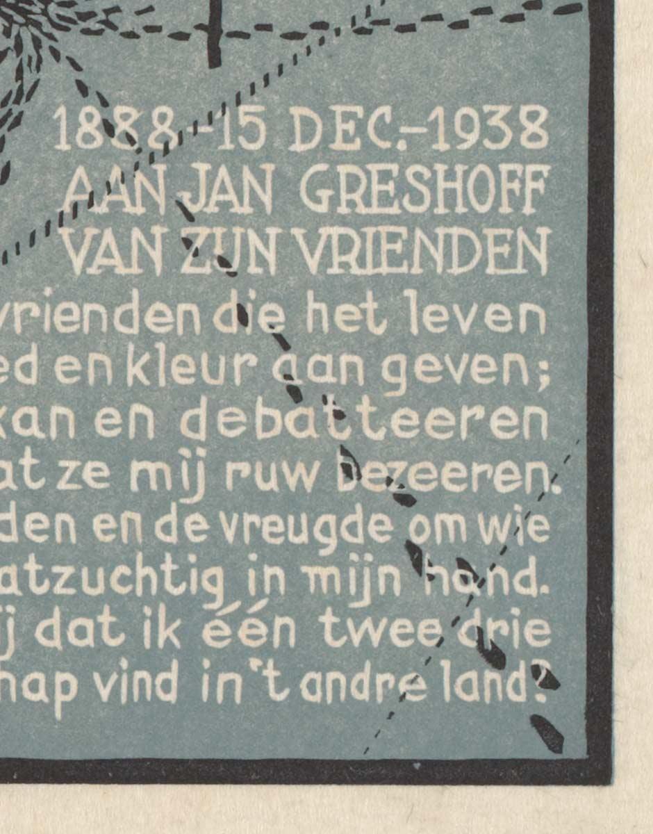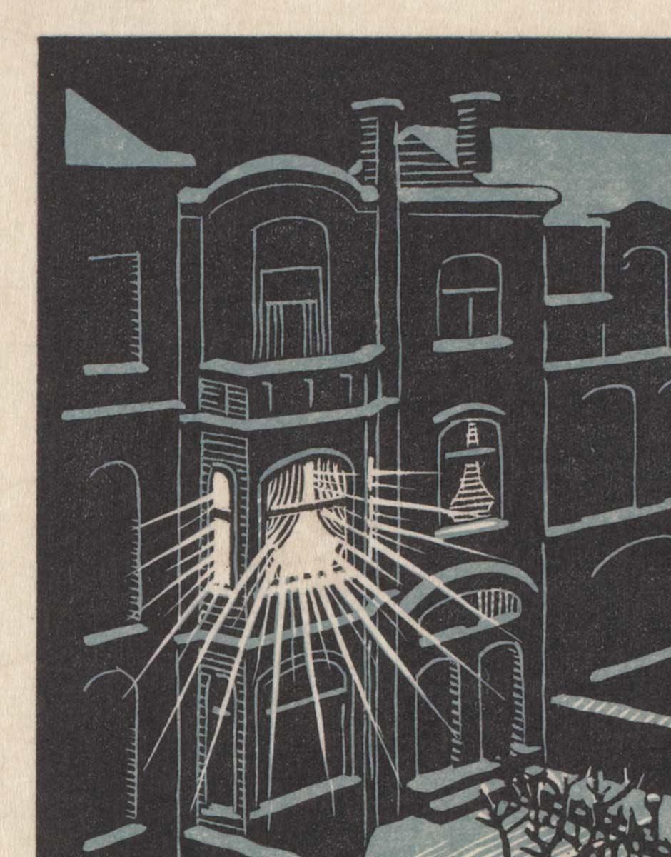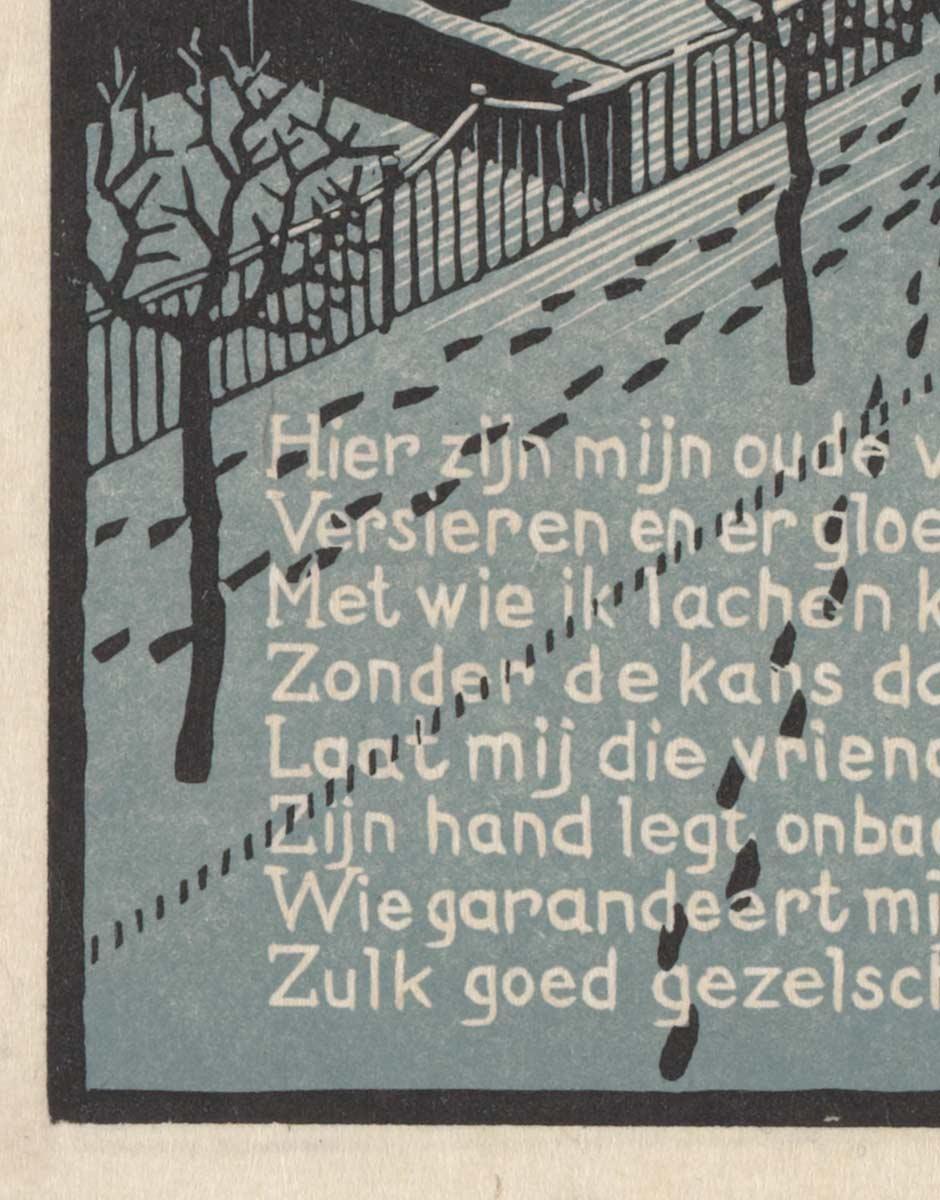 Op de houtsnede zijn in de winternacht een aantal huizen in een straat te zien, waarvan alleen dat van Greshoff is verlicht. Uit diverse richtingen leiden voetstappen in de sneeuw naar de voordeur van de woning. Het huis van Greshoff is later vernietigd, wat de prent ook historische betekenis geeft.