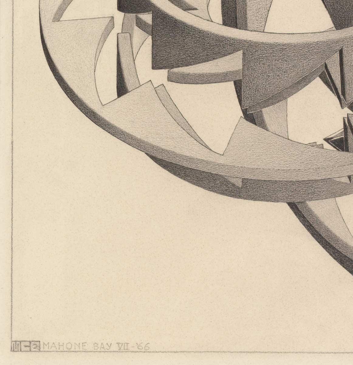 Vader en zoon communiceerden in die jaren vooral per brief omdat George en Corrie in 1958 naar Canada geëmigreerd waren. Maar in de zomer van 1966 hadden ze genoeg tijd om echt bij te praten. Van 1 juni tot 17 juli verbleven Maurits en Jetta bij hun zoon en schoondochter in Mahone Bay, aan de zuidkust van Nova Scotia. Escher was er echter niet alleen voor zijn rust en het contact. Hij nam werk mee in vorm van ideeën voor nieuwe prenten. Een daarvan was het plan voor Levensweg III, een nieuwe knoop die hij pas bij terugkomst in Baarn af zou maken. En een idee voor nóg een knopenprent, een variant op het kruisprofiel linksboven in de eerste Knopen. In Mahone Bay maakte hij een prachtige tekening van deze nieuwe Möbius-knoop, maar de litho die hij wilde maken zou er nooit komen.