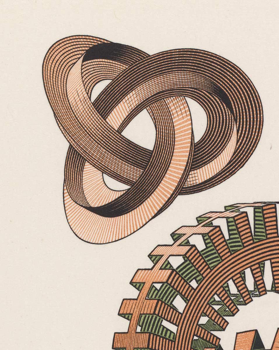 De ontmoeting stimuleerde hem ook om weer aan het werk te gaan na een periode van veel ziekenhuisbezoeken en meerdere operaties. Een prent van Flocon in diens Topographics vormde de rechtstreekse inspiratie voor een nieuwe houtsnede. In deze prachtuitgave vond Escher een gravure van een aantal knopen die hem intrigeerde.**