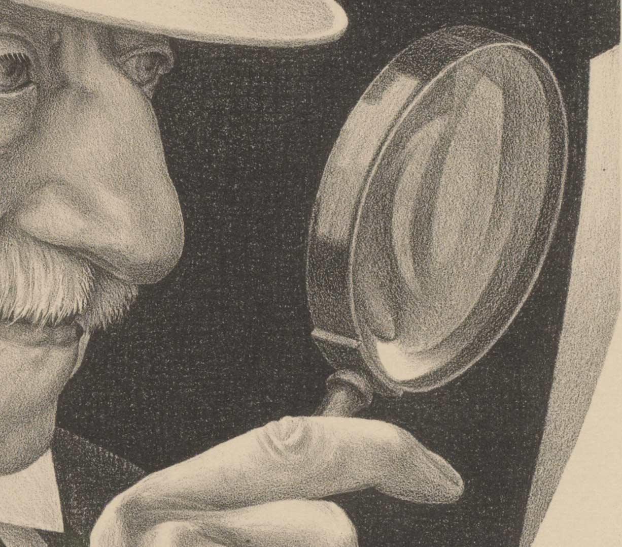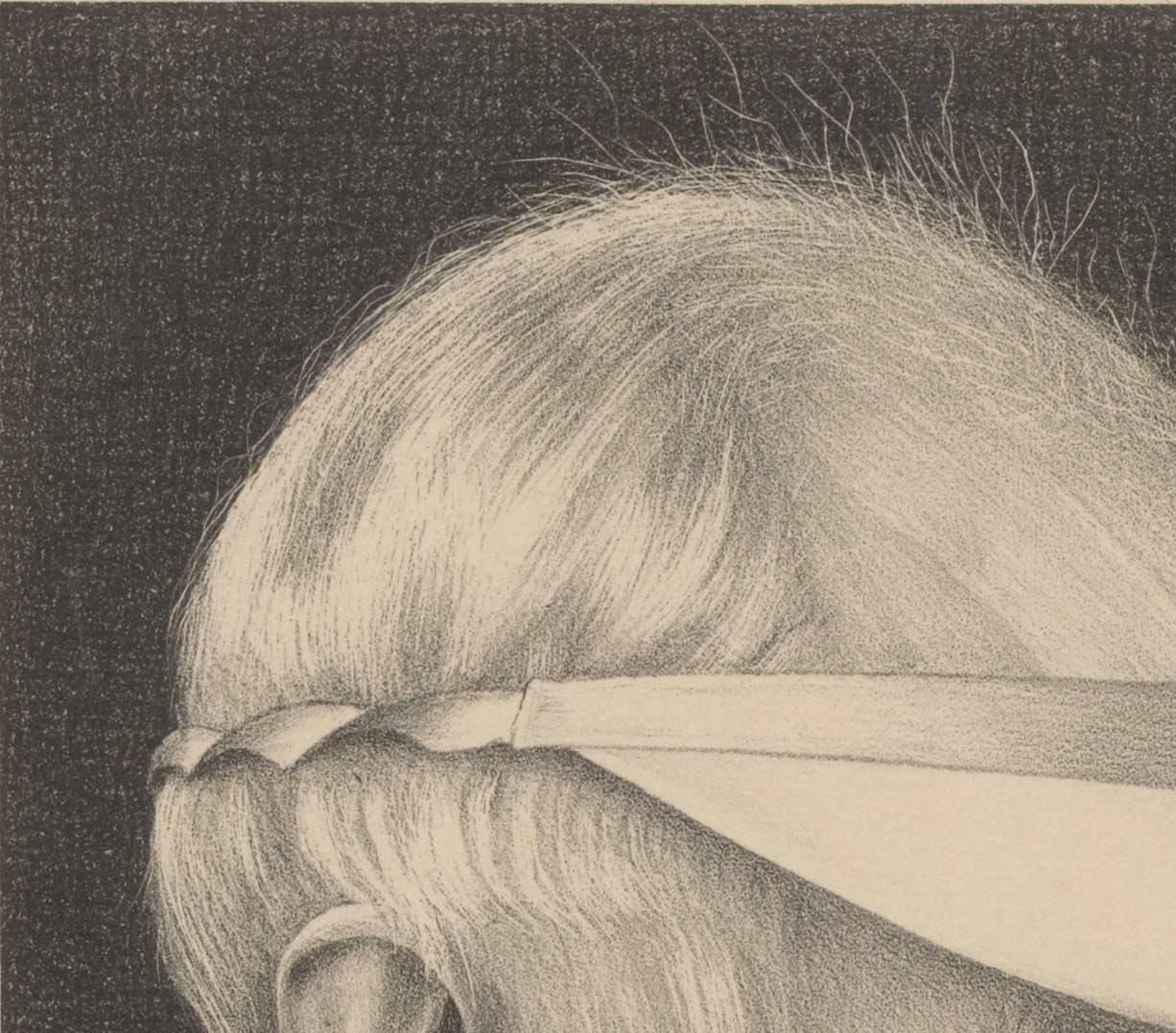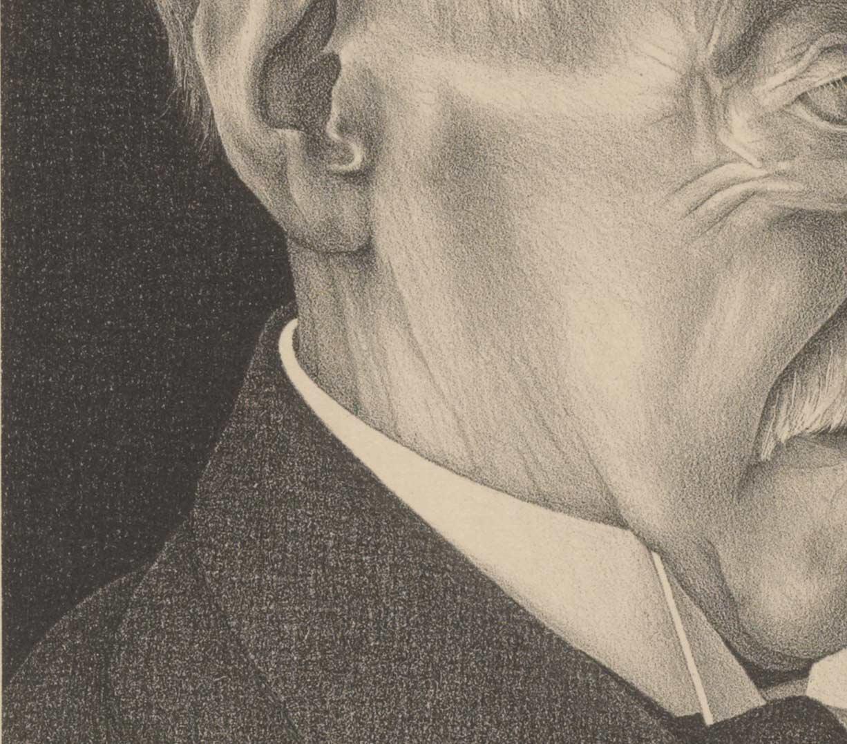 'Bij het grafisch portretteren van iemand met sterk a-symmetrische gelaatstrekken gaat de gelijkenis grotendeels verloren op de afdruk, die immers geheel het spiegelbeeld is van het originele werkstuk. Daarom werd in dit geval een 'tegendruk' gemaakt, d.w.z.: terwijl de drukinkt op het papier van een eerste afdruk nog vochtig was, werd deze afgedrukt op een tweede vel papier, waarop de spiegeling dus is opgeheven. Het 'bewijs' levert de handtekening van de geportretteerde, die hij met lithografisch krijt op de steen zette en die hier, twee maal gespiegeld, gelijk aan het origineel, zichtbaar is.'