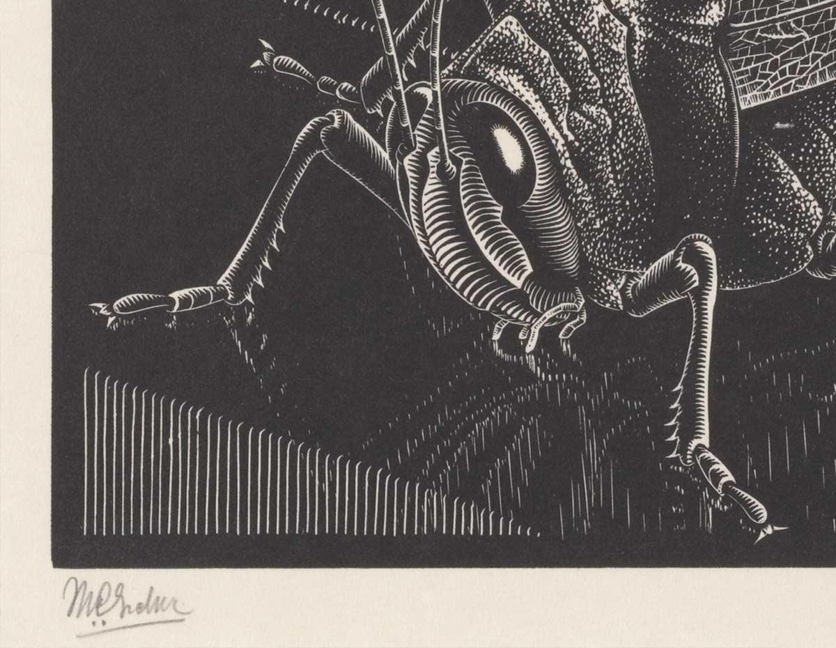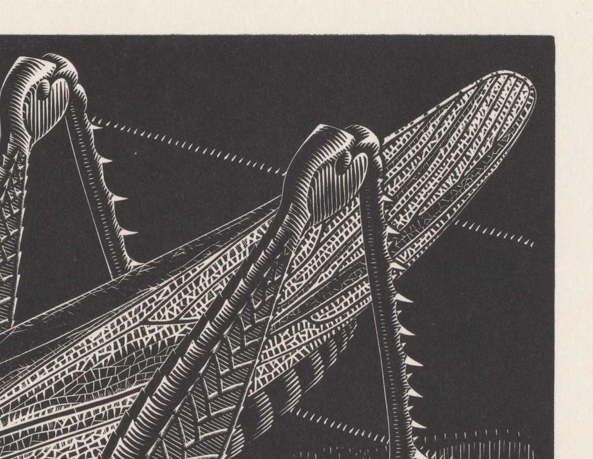 We hebben deze week weer een wissel gehad. Een aantal werken is naar het depot gegaan en daarvoor in de plaats hangen een aantal andere prenten van Escher. Een van deze is Sprinkhaan, een houtgravure uit maart 1935. Daarop toont Escher in zeer fijn detail een exemplaar van dit gevleugelde insect met zijn krachtige achterpoten, facetogen, voelsprieten en gevouwen vleugels.