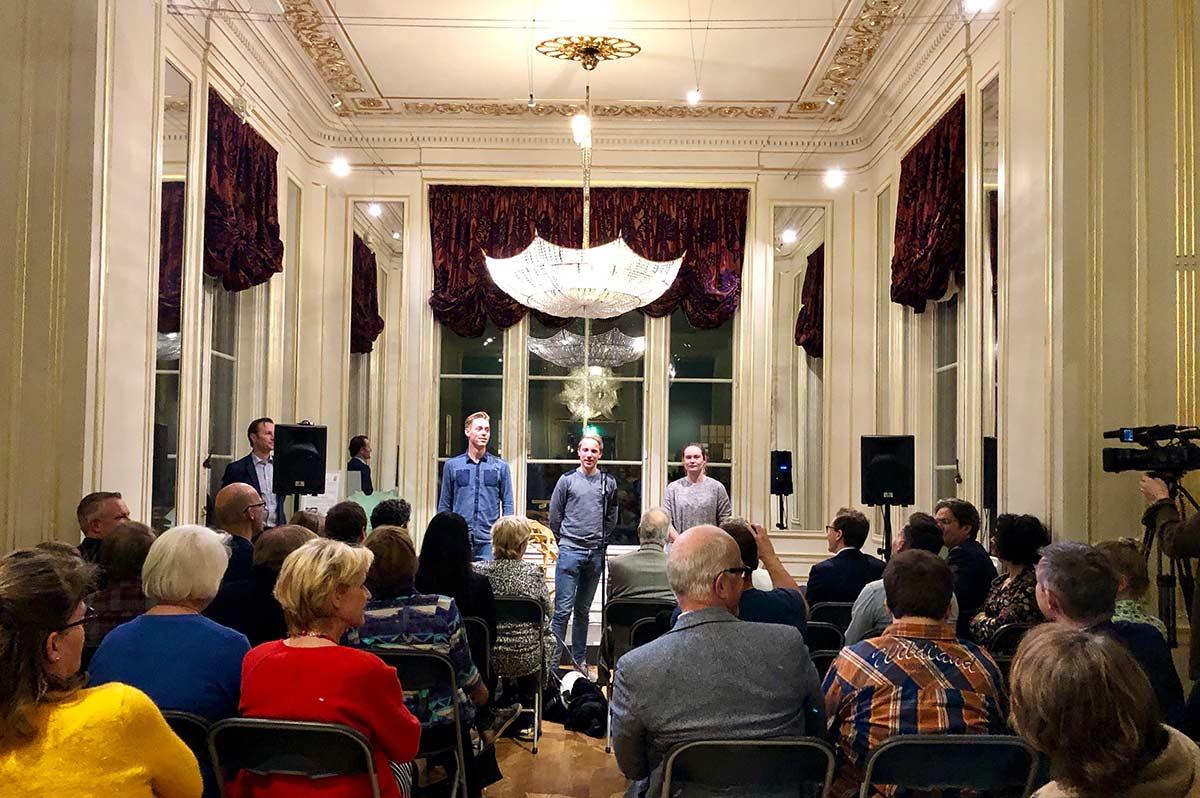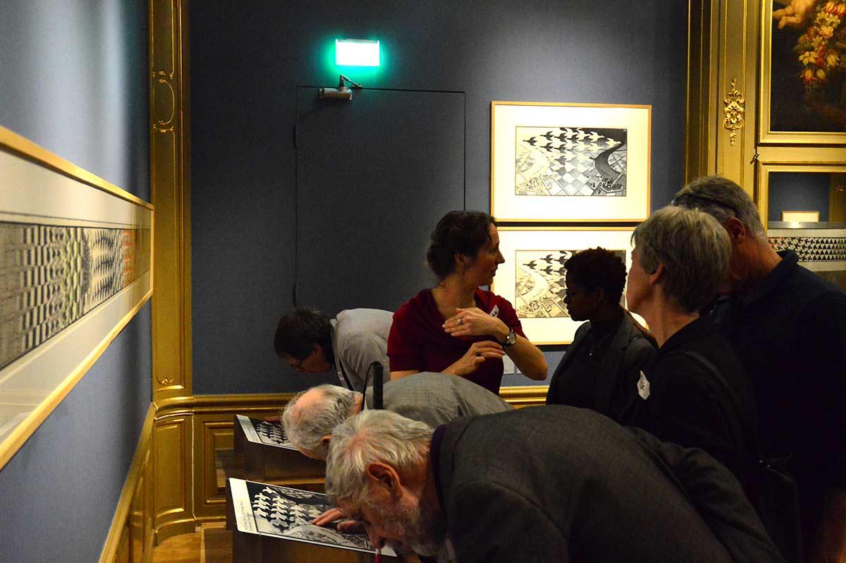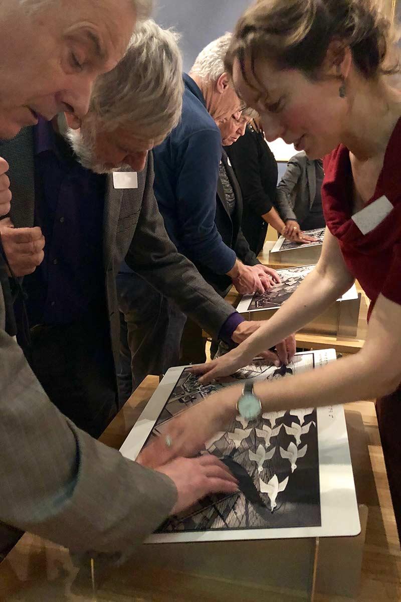 Escher in Het Paleis kijkt met trots terug op een prachtige eerste openingsavond voor blinden en slechtzienden. Ruim 90 gasten zagen hoe Saskia Bruines (wethouder Onderwijs) namens de Gemeente Den Haag de opening verrichtte. Ook luisterden ze naar korte speeches van Benno Tempel (directeur van het Gemeentemuseum en van Escher in Het Paleis), Marcel Westerdiep (general manager van Het Paleis), leerlingen van ISW Hoogeland en leerlingen van de Haagse Hogeschool. De genodigden uit de doelgroep kregen daarna een intensief programma voorgeschoteld bestaande uit een interactieve rondleiding en een sessie waarbij de zintuigen werden aangesproken. Speciaal getrainde rondleiders vertelden over het leven en werk van Maurits Cornelis Escher. De overige gasten konden na afloop van de rondleiding ook genieten van de speciaal ontwikkelde stukken, van Het Paleis en natuurlijk van het werk van Escher. Wij zijn heel enthousiast over het verloop van deze avond en we denken dat we onze blinde en slechtzienden gasten echt iets mee kunnen geven over het leven en het werk van deze meestergraficus. In 2019 zullen er dan ook meer van deze bijzondere openstellingen komen. Houd deze website in de gaten voor meer informatie.