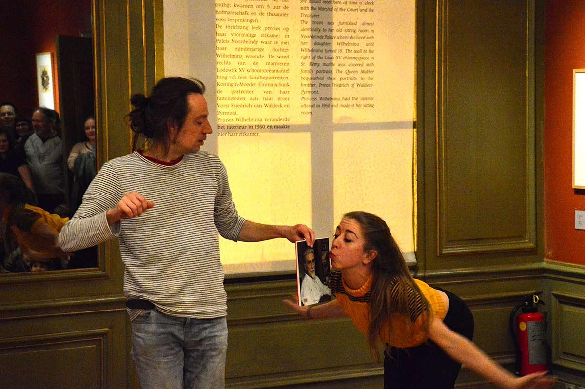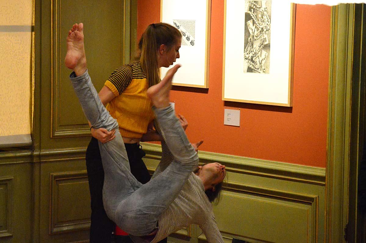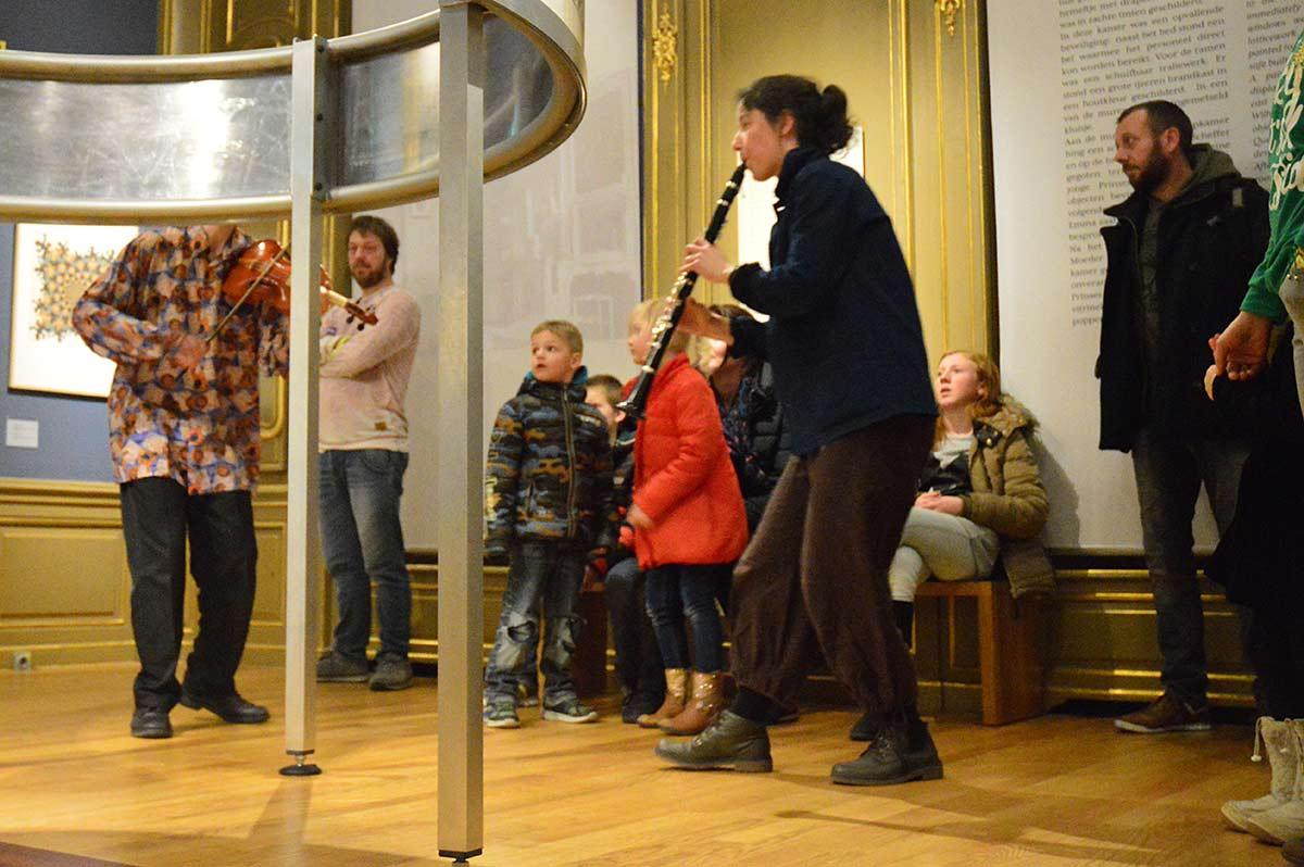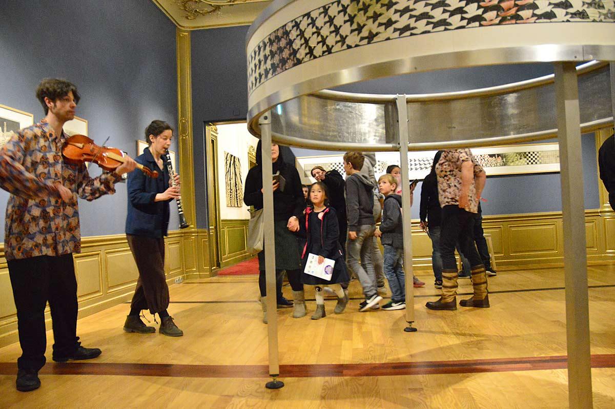 De muzikanten van DaMu Collective improviseerden met viool en klarinet op het werk van Escher. In de voorstelling 'Gratis Walhalla' probeerden dichter Arnoud en danseres Hanne met woorden, handen en voeten uit te leggen waarom mensen kunst maken. En waarom er nieuwe dieren worden uitgevonden. En waarom het ze toch steeds net niet helemaal lukt.