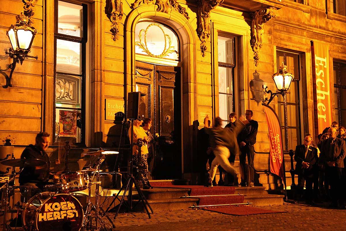 De culturele nachtbrakers begonnen het bal met een knal: drummer Koen Herfst zette het Lange Voorhout op stelten met een knallende drumsolo. Danseres Lindy Bremer nam het publiek mee in haar performance en verzorgde de opening van het paleis door de toegestroomde bezoekers al dansend voor te gaan. In de Balzaal bracht pianist Marcel Worms het publiek in vervoering met een uitvoering, in maar liefst 5 optredens, van het complete eerste boek van het Wohltemperierte Klavier van Johann Sebastian Bach. Dichter Arnoud Rigter sprak in wonderlijke zinnen en elliptische constructies over het raadsel van de tijd. Ook konden bezoekers genieten van een werk van M.C. Escher in een privékamer, om even te ontsnappen aan de drukte. Het atelier in het souterrain was het podium voor een oneindige schaakateliersimultaanstrijd, verzorgd door de schakers van de Haagse Schaakvereniging. In het café kon iedereen meedoen aan een popquiz en daarna los gaan in de disco. En uiteraard kon iedereen deze avond genieten van de meesterlijke kunst van Nederlands beroemdste graficus.