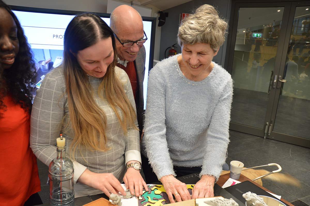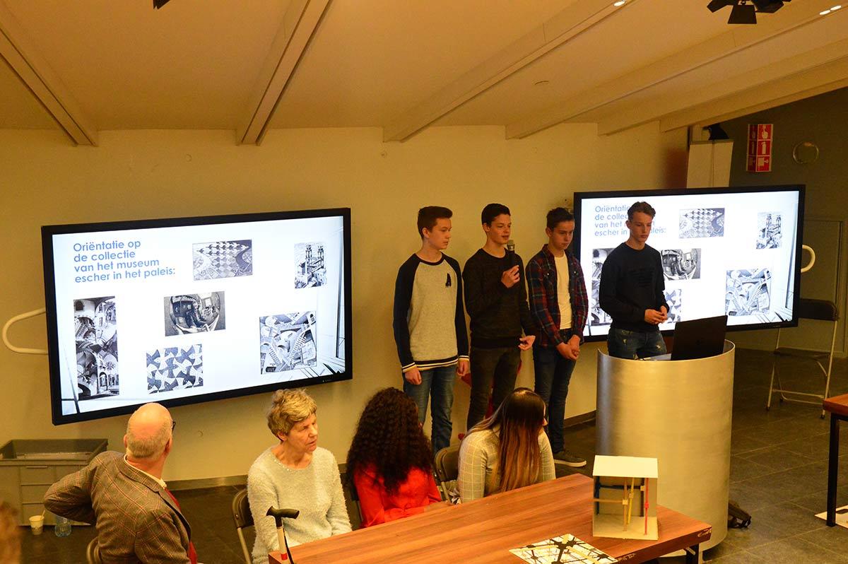 2018 was een bijzonder jaar voor M.C. Escher en voor museum Escher in Het Paleis. Afgelopen jaar is er namelijk een uniek samenwerkingsproject tot stand gebracht tussen de Haagse Hogeschool, de middelbare school ISW Hoogeland, Koninklijke Visio, stichting Voorall en het museum. De Technasium leerlingen van ISW Hoogeland onderzochten hoe de werken van Escher toegankelijk gemaakt kunnen worden voor mensen met een visuele of licht verstandelijke beperking. Een prachtige kans om ervaring op te doen met een doelgroep die zich maar al te vaak buiten hun belevingswereld bevindt. Ze zijn met hen in gesprek gegaan om te komen tot nieuwe ideeën en oplossingen zodat iedereen kan genieten van het bijzondere werk van deze beroemde graficus. Visio en Voorall ondersteunden ze daarbij. De studenten Bestuurskunde van de Haagse Hogeschool hadden de opdracht om te zorgen dat goede ideeën ook daadwerkelijk gerealiseerd worden. Uiteindelijk is gekozen om alleen de plannen voor de mensen met een visuele beperking ook daadwerkelijk in een subsidieaanvraag op te nemen bij de Gemeente Den Haag. Een geslaagde aanvraag, zo bleek. De subsidie werd toegekend en daarmee zijn een aantal unieke stukken geproduceerd die gebruikt worden om niet alleen werk van M.C. Escher voelbaar te maken, maar juist ook om het verhaal achter de kunstenaar en zijn technieken beleefbaar te maken voor mensen die blind of visueel beperkt zijn.