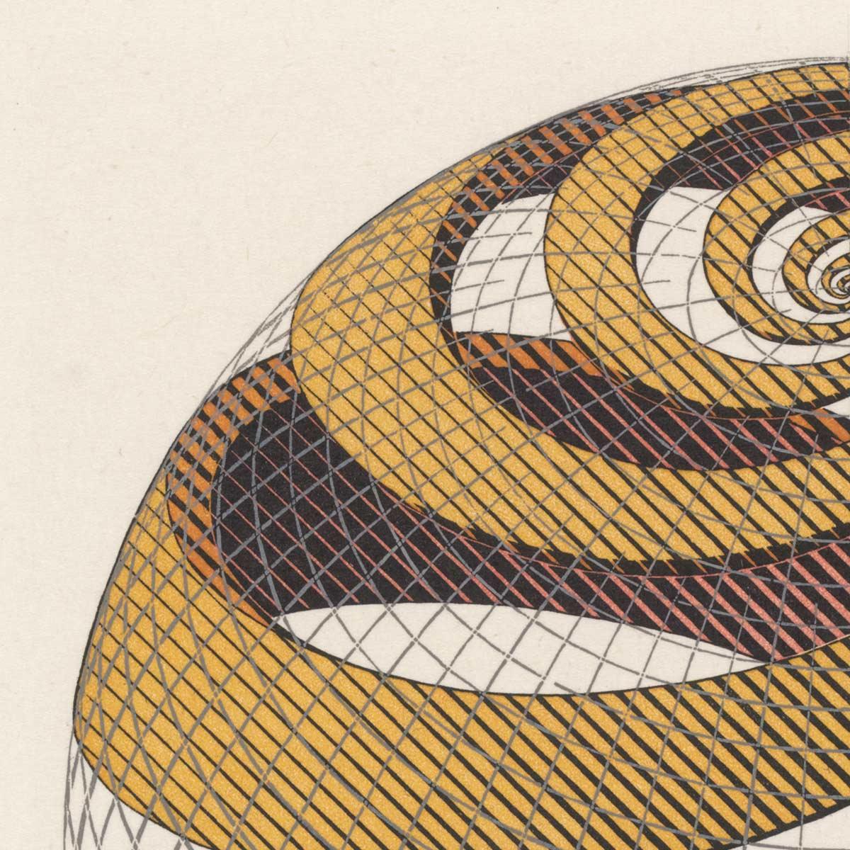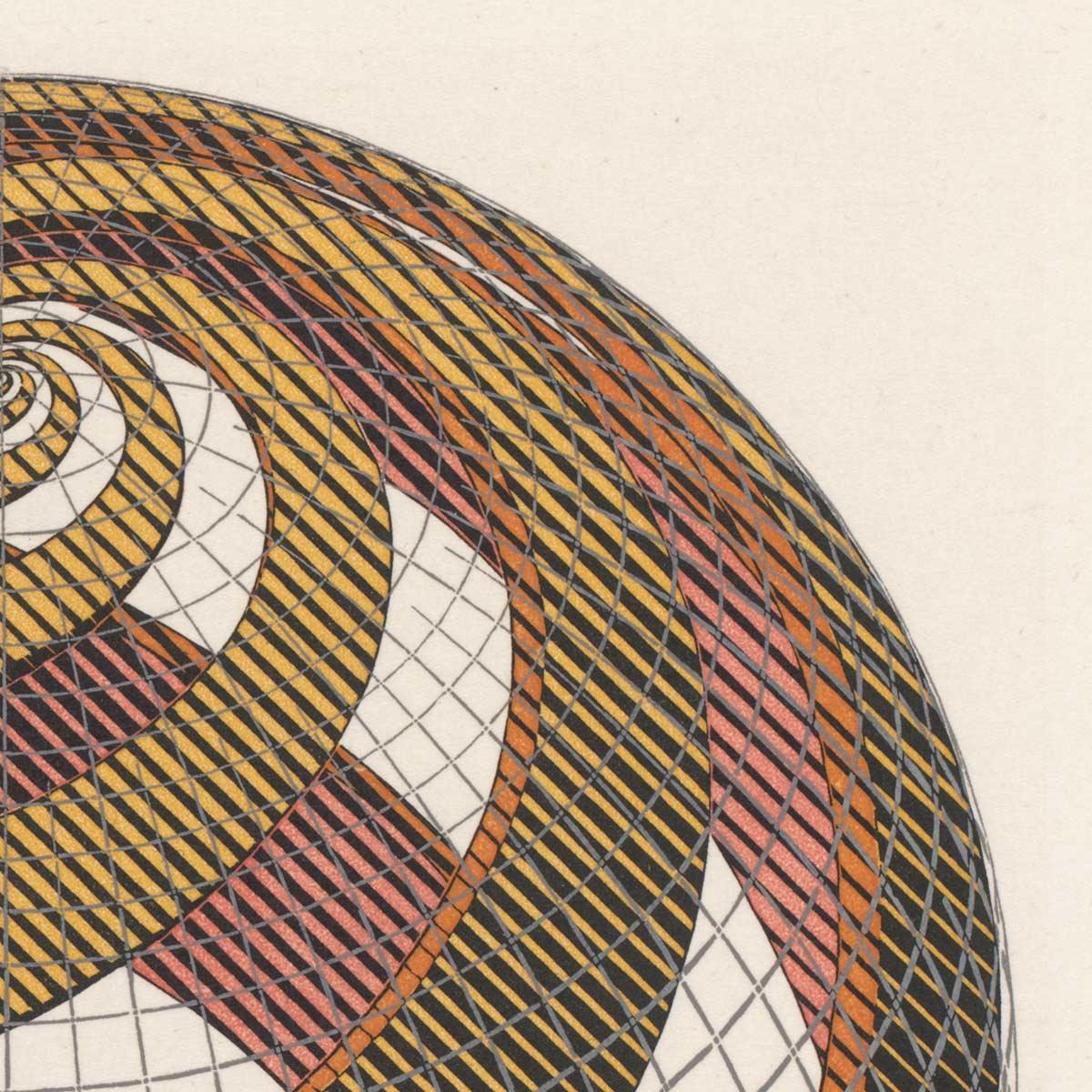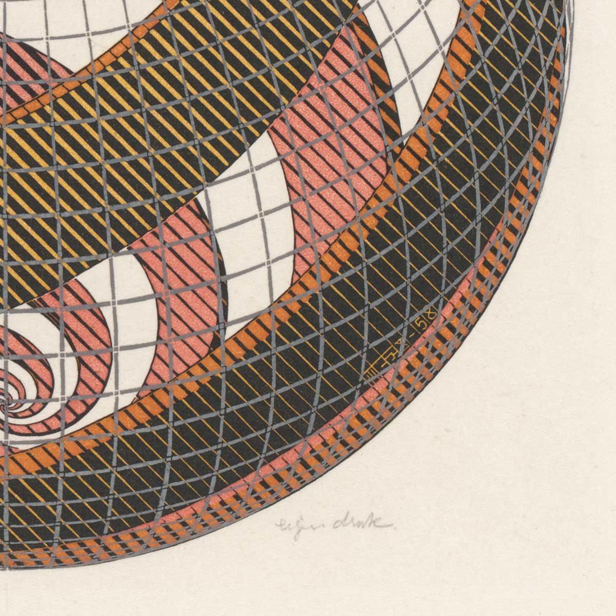 Wie wat langer naar deze prent kijkt, ziet de bol voor zijn ogen draaien. Net als de draaiende rood-wit-blauwe spiralen die kappers vroeger aan de buitenmuur van hun zaak bevestigden. Bolspiralen is vooral een getuigenis van Eschers ongelooflijke beheersing van de techniek en van zijn volhardendheid om een complexe vorm tot leven te laten komen.