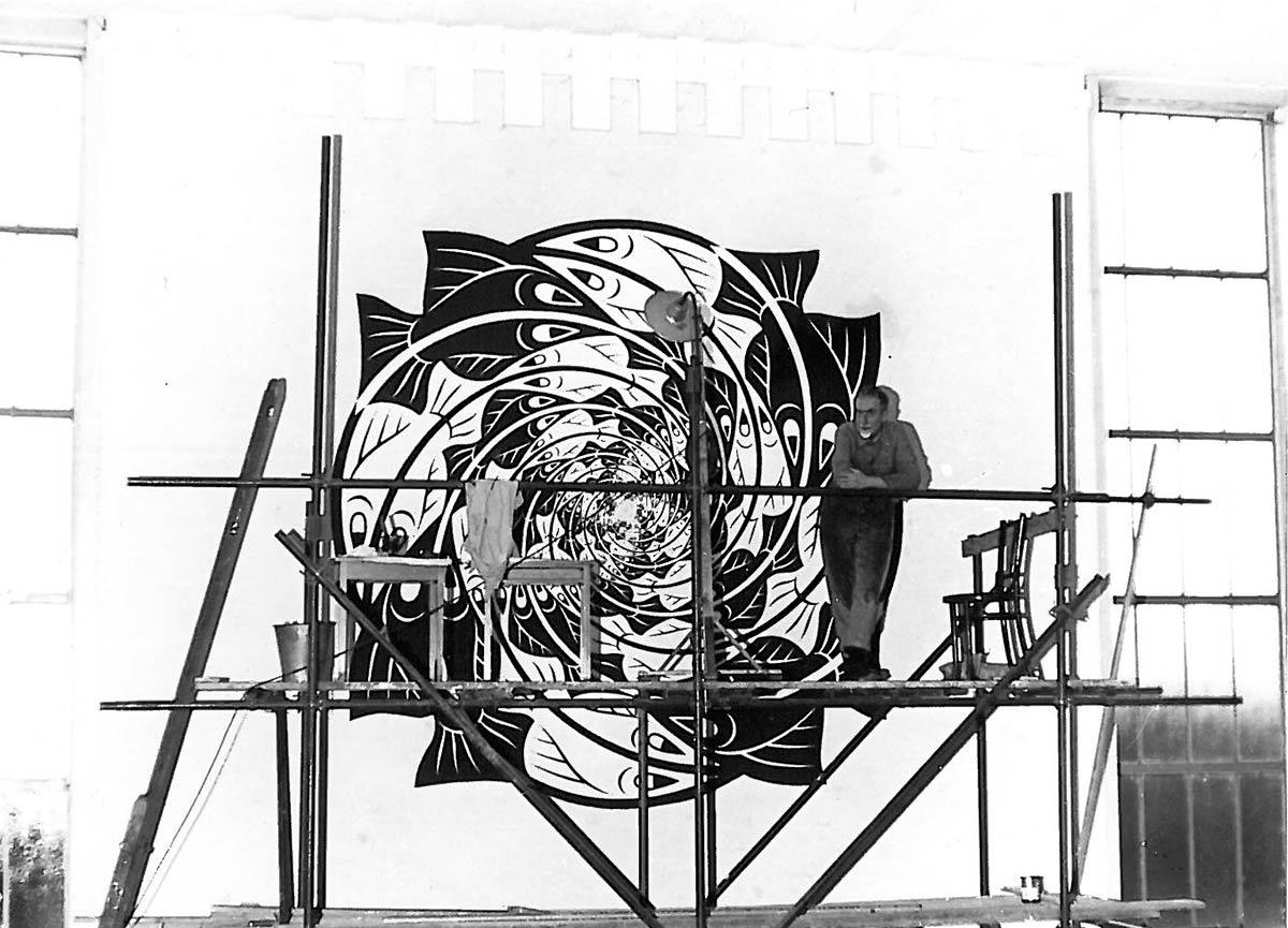 'Daartoe maakte ik een tekening op schaal één op twintig en nu schijnt het, dat de commissie, die dat ding moet beoordelen, het er wel mee eens is. Hoewel de zaak dus nog mis kan lopen omdat de opdracht nog niet officieel in mijn bezit is, ben ik hoopvol dienaangaande gestemd. Het is leuk om eens zelf op de steiger te gaan staan en een maand lang een oppervlak van circa drie en een half bij drie meter te bekladden. Ik maakte een vlakverdeling, die bestaat uit louter vissen, welke spiraalsgewijze zich in zwart naar een centrum toe (de dood of het sterven symboliserende) en tegelijkertijd in witte reeksen zich, uit datzelfde centrum voortkomende, naar buiten "bewegen" (het leven, de geboorte). Het leuke en het moeilijke tegelijkertijd, is het verkleinen tot in het oneindige van de vis-figuren. De buitenste exemplaren krijgen een lengte van circa één meter zestig en ik wil proberen om consequent de verkleining voort te zetten tot het vlekjes van bijvoorbeeld een centimeter worden.'
