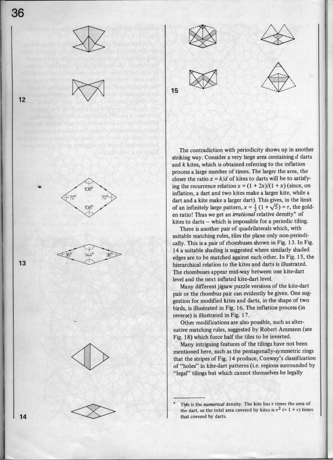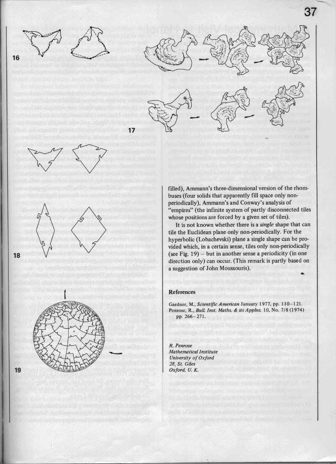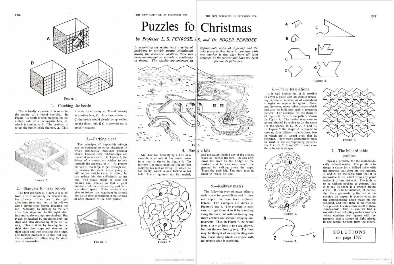 Ook Penrose had niet stil gezeten. Hij bleef puzzelen om een vlakvulling te vinden die nooit horizontaal of verticaal in herhaling valt. Lang leek het onmogelijk dat zo'n oneindig vlak volgens een geordend patroon gevuld kan worden zonder repetitief te worden. Tot in de jaren 50 waren eigenlijk alle wiskundigen daarvan overtuigd. Een vlakvulling van zich herhalende vormen moest zich wel tot het oneindige uit kunnen strekken. Als de basisbetegeling steeds herhaald kan worden, dan is hij periodiek. Maar langzaam rees de consensus dat er ook vlakvullingen moesten bestaan die niet willekeurig herhaald konden worden. Roger Penrose schreef er in 1958 al een artikel over voor de kersteditie van New Scientist, samen met zijn vader Lionel Penrose. Daarin lieten ze lezers puzzelen op deze a-periodieke betegelingen, op basis van zeven verschillende basisvormen.
