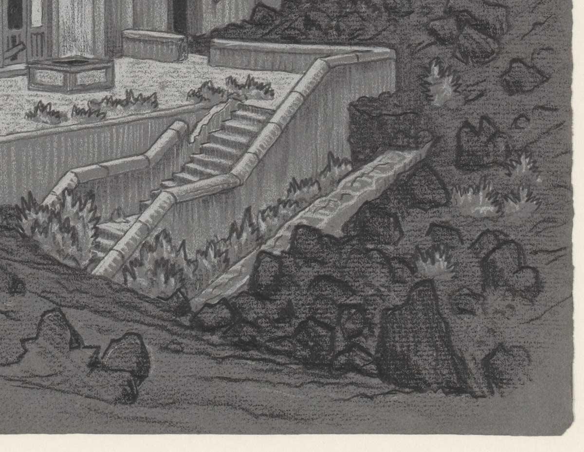 M.C. Escher, Lava Presso Nunziata, tekening in wit en zwart krijt op grijs papier, 4 mei 1936