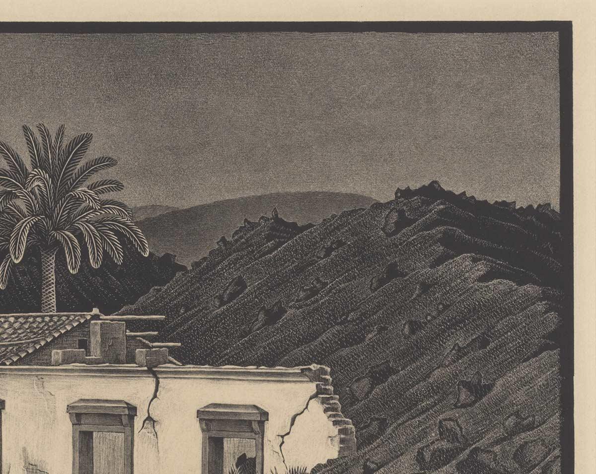 Op de litho die hij maakte in augustus 1936 schittert de vulkaan echter door afwezigheid. In plaats daarvan toont Escher de gevolgen van de grote uitbarsting in november 1928, waarbij het dorp Mascali volledig van de kaart werd geveegd. De lavastroom van die uitbarsting was toen nog volop te zien in het landschap en Escher maakt er meerdere prenten over. In Nunziata, een dorpje vlak bij Mascali, trof hij dit huis aan dat volledig omringd werd door zwarte lava. Een beeld dat zowel duister als feeëriek aan doet.