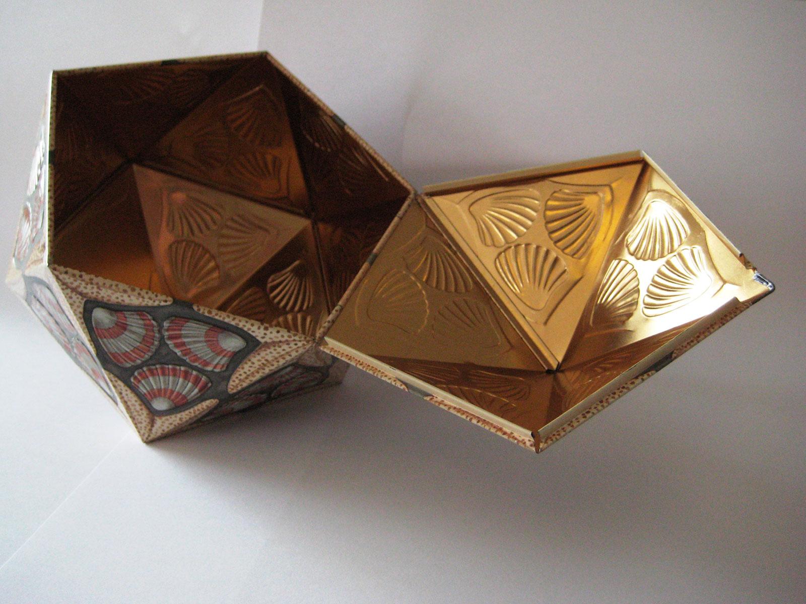 Tussen de zeesterren liggen gestreepte schelpen. Escher was hier volgens Van der Grijn niet helemaal tevreden over, maar bracht dit “offer”, omdat dit een technische voorkeur van de fabriek was. Het resultaat is een verbluffend blikje. Hoe je het ook draait of keert, het patroon blijft altijd hetzelfde door de icosaëder met haar twintig gelijkzijdige driehoeken.