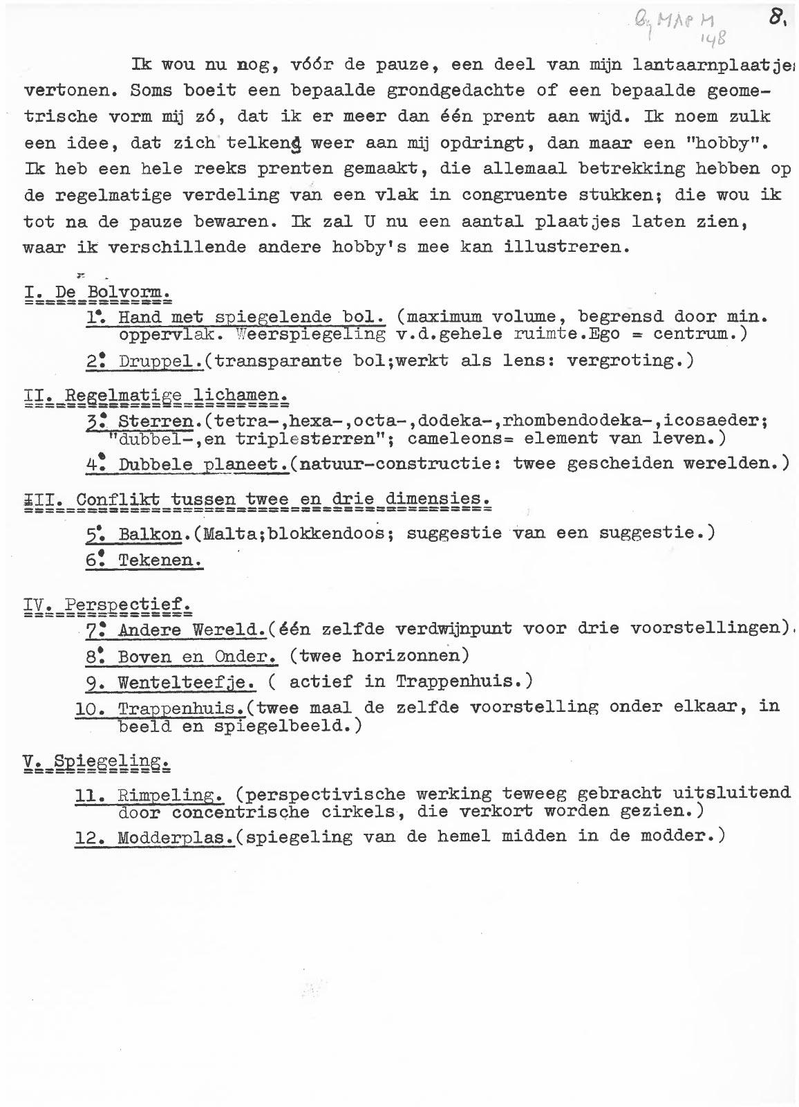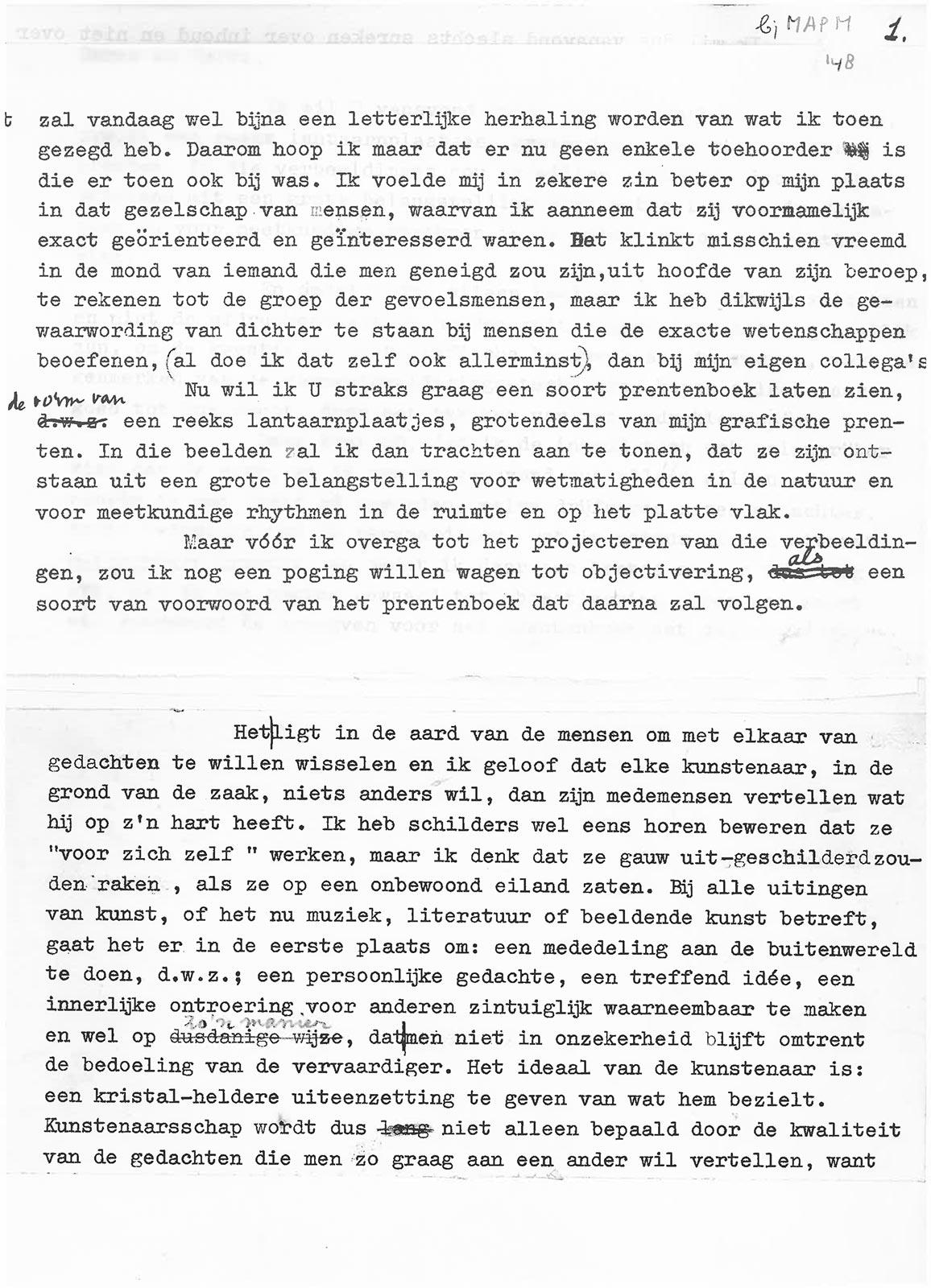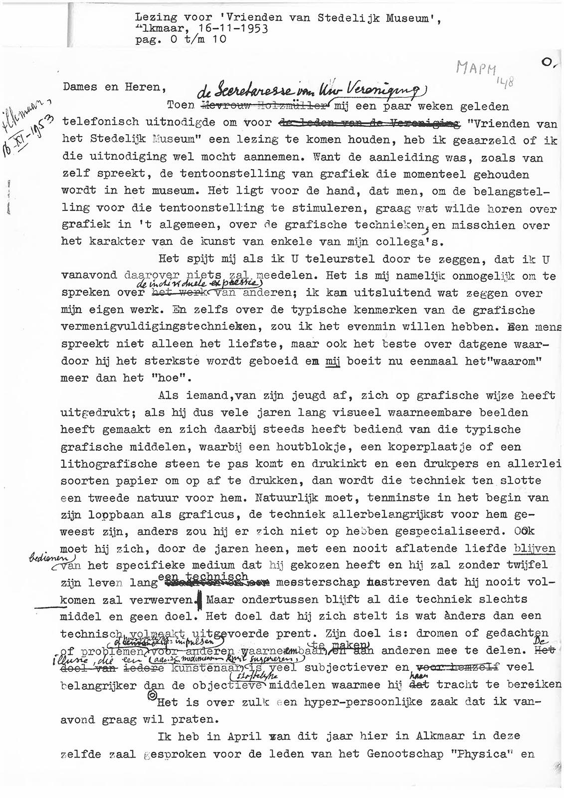 Op 16 november 1953 houdt Escher een lezing voor de 'Vrienden van het Stedelijk Museum' in Alkmaar, ter gelegenheid van een tentoonstelling van zijn werk. In die jaren lukt het Escher regelmatig om te exposeren in musea, galerieën en universitaire instituten. Vaak in gezelschap van twee of meer collega's uit de vereniging van Nederlandse Grafici. Meestal gaat dit vergezeld van een lezing over zijn eigen werk.