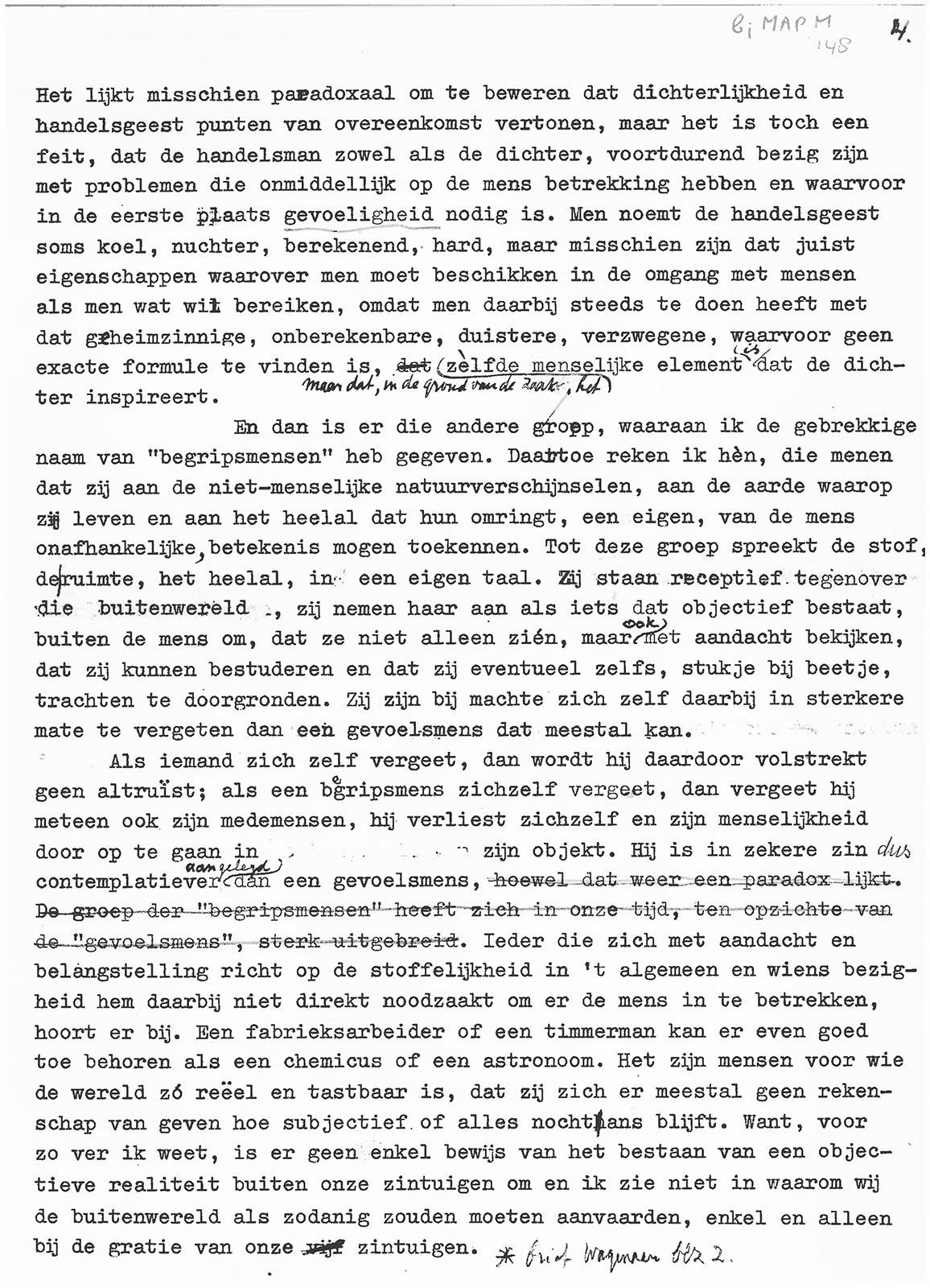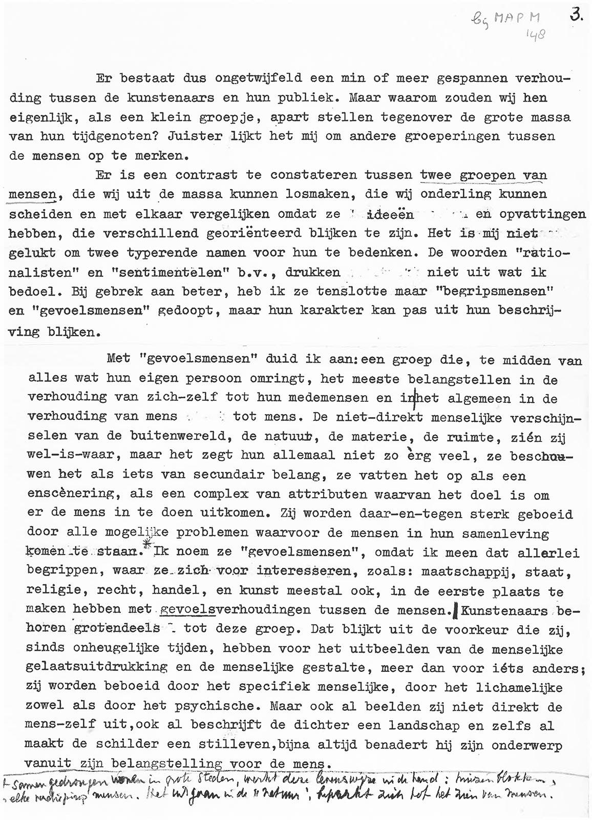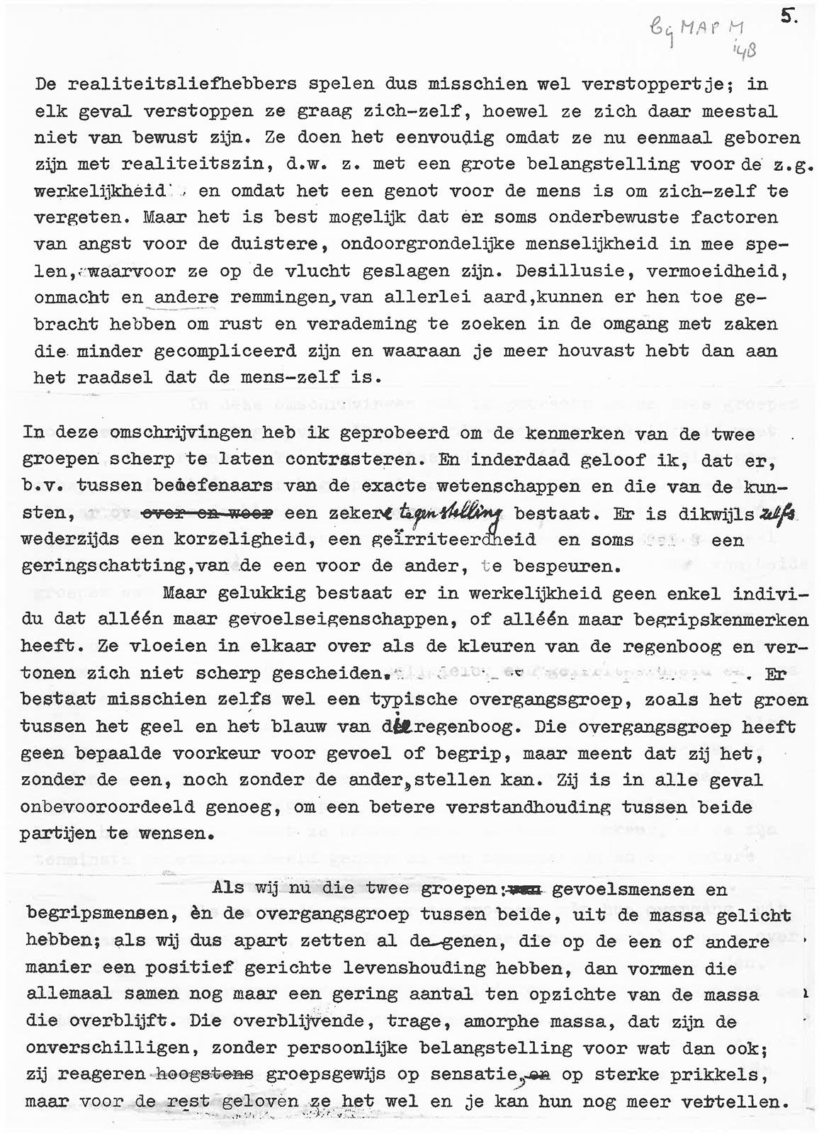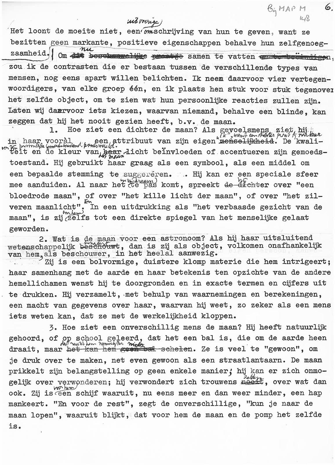 Bij de lezing in Alkmaar spreekt Escher onder andere over 'gevoelsmensen', 'begripsmensen' en 'onverschilligen'. Hij geeft voorbeelden van de beleving van de maan door een lid van elke groep. Hij stelt dat begrip en gevoel meestal in elkaar overvloeien, en dat niemand tot slechts een van die twee groepen behoort. Ook is iedereen wel eens onverschillig, maar het gaat erom je daar weer aan te ontworstelen en terug te keren tot de staat van onbevangenheid waarmee een kind de wereld tegemoet treedt.