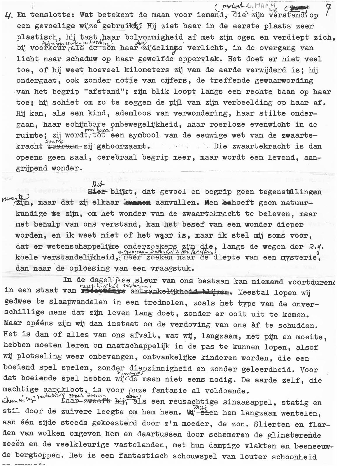 "Voor dat boeiende spel hebben wij de maan niet eens nodig. De aarde zelf, die machtige aardkloot, is voor onze fantasie al voldoende. Ik zie hem in mijn verbeelding soms zweven als een reusachtige sinaasappel, statig en stil door de zuivere leegte om hem heen. Ik zie hem langzaam wentelen, aan één zijde steeds gekoesterd door z'n moeder, de zon. Slierten en flarden van wolken omgeven hem en daartussendoor schemeren de glinsterende zeeën en de veelkleurige vastelanden, met hun dampige vlakten en besneeuwde bergtoppen. Het is een fantastisch schouwspel van louter schoonheid en vreugde."