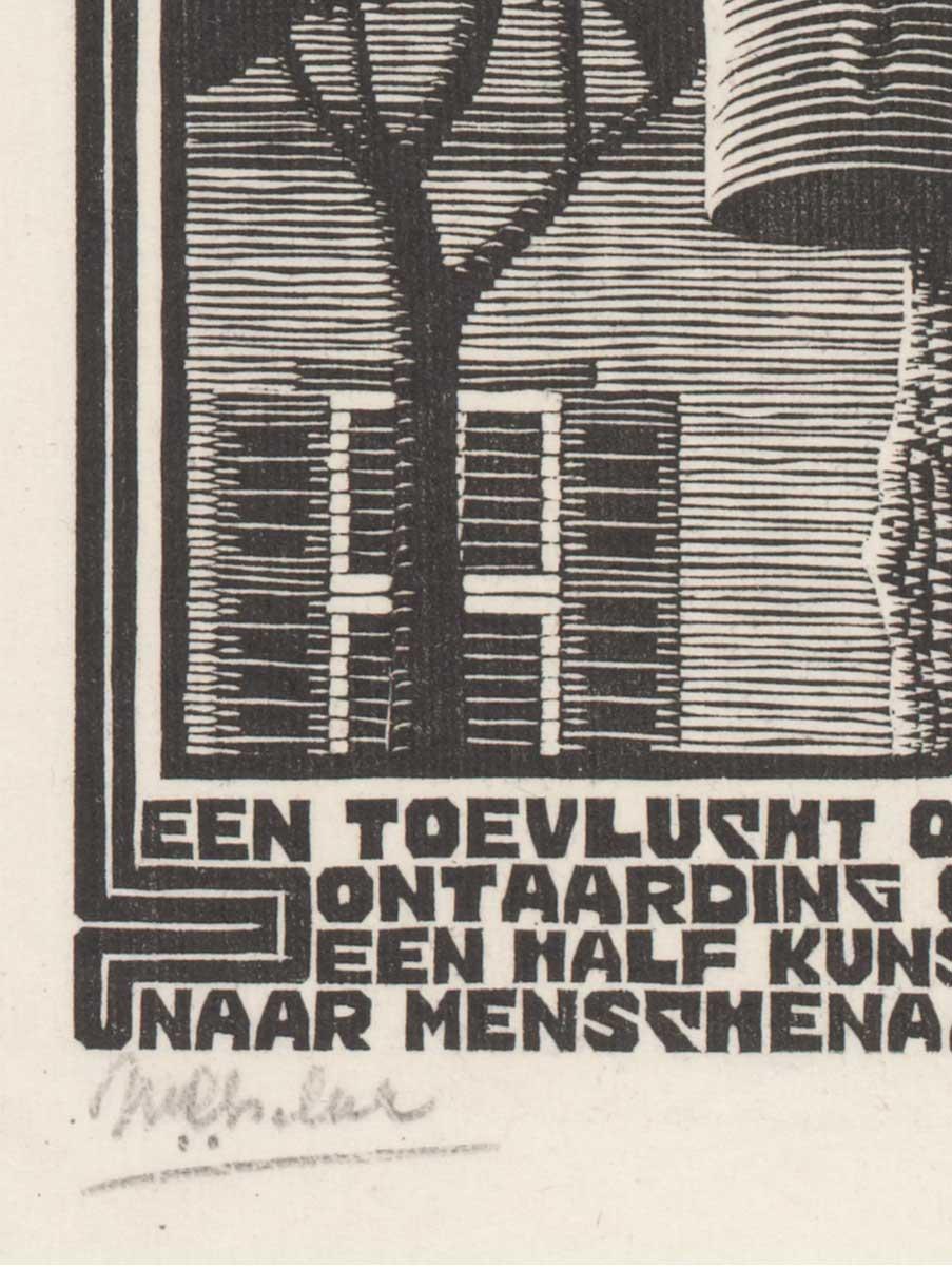 Een van die prenten is Schuilnest. Daarop staat een vogelhuisje, hangend aan een boom. Een onschuldig beeld dat door de titel al een andere lading krijgt. Maar door het bijbehorende motto en het gedicht wordt dat effect nog sterker. Hoewel Escher niet bepaald fan was van het zoeken naar betekenis in zijn werk, nodigen de Emblemata juist door die teksten daartoe bij uitstek uit.