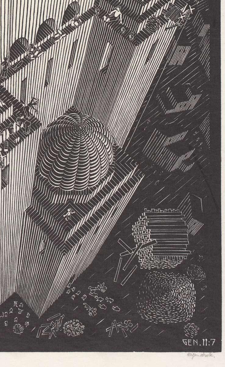 In 1928 maakt M.C. Escher een prent van een gebouw dat symbool staat voor de verwarring tussen mensen, maar door Eschers aanpak nog eens extra vervreemdend werkt: de toren van Babel. Later zal Escher wereldberoemd worden door zijn grafiek vol optische illusies, waarin hij de zwaartekracht tart, trappen eindeloos door kan laten lopen en vogels in vissen kan laten veranderen. Onmogelijke bouwwerken hebben een belangrijke plek in zijn latere prenten, maar in 1928 is het nog geen vast thema. Zijn vroege werk bestaat vooral uit prille houtsneden van personen en weergaloze weergaven van de natuur, waarin hij zijn talent voor grafiek verkent. In de prenten uit het begin van zijn carrière zoekt hij ook af en toe Bijbelse thema’s op. Zo beeldt hij Adam en Eva in het Paradijs af en kent Escher met zijn serie van de zes scheppingsdagen uit 1926 enig succes.