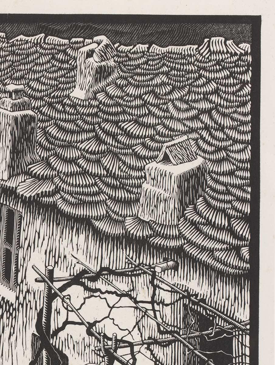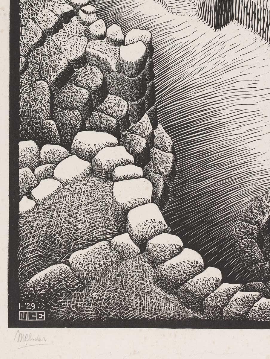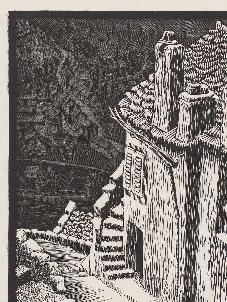 Zoals in deze houtsnede van het Corsicaanse bergstadje Corte. Escher bezocht het eiland in het voorjaar van 1928, met zijn schoonvader*. Jetta bleef thuis; ze was zwanger van hun tweede kind. Vanaf een muurtje kijkt een witte kat een steegje in van het schijnbaar verlaten plaatsje. Subtiel aanwezig, maar toch dwingend.
