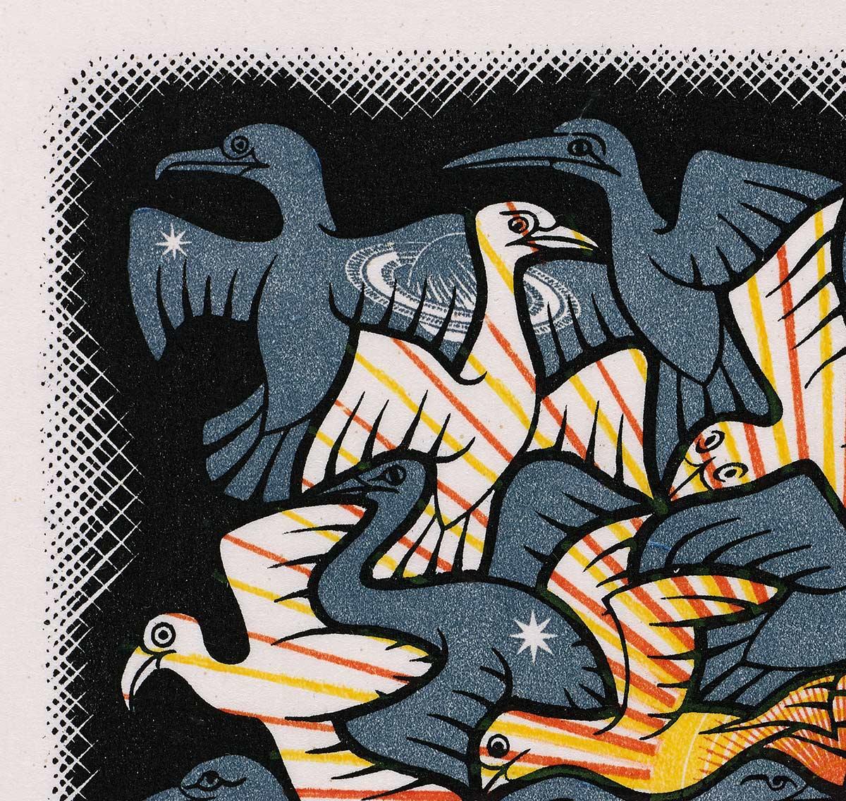 Vogels keren regelmatig terug in het werk van Escher, meestal in een van zijn vele vlakverdelingen. Zo ook in Zon en maan, een houtsnede uit april 1948. Toch is er iets bijzonders aan deze prent.