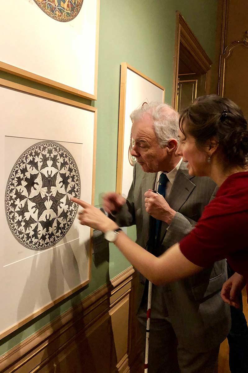 Deze versie van de audiotour met 8 topstukken uit het oeuvre van M.C. Escher is speciaal gemaakt voor blinden en slechtzienden. Zij kunnen deze bijzondere werken leren kennen aan de hand van een uitgebreide audiobeschrijving. Hierin laten we de werken zoveel mogelijk tot leven komen. De audiotour is beschikbaar in de Bloomberg Connects App.