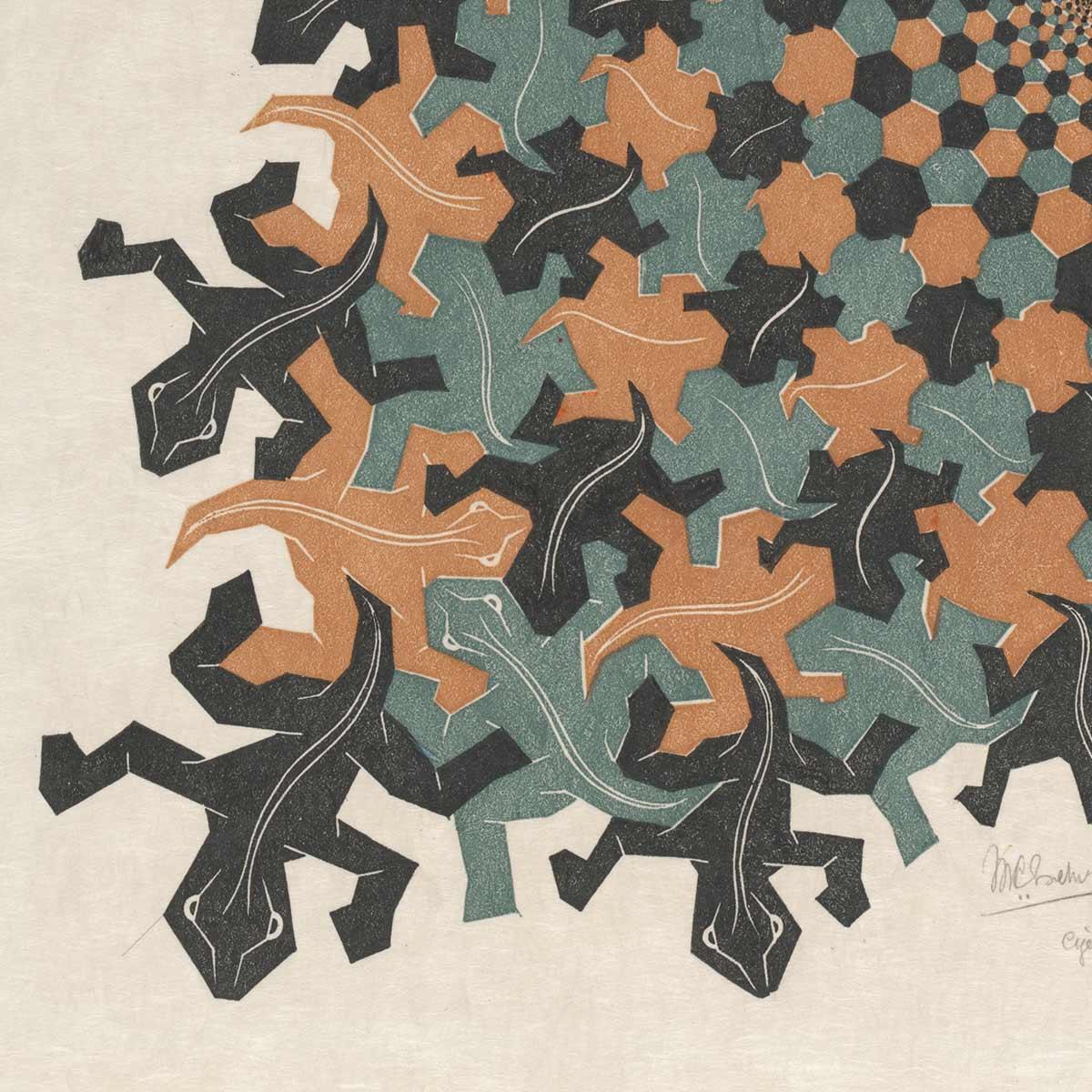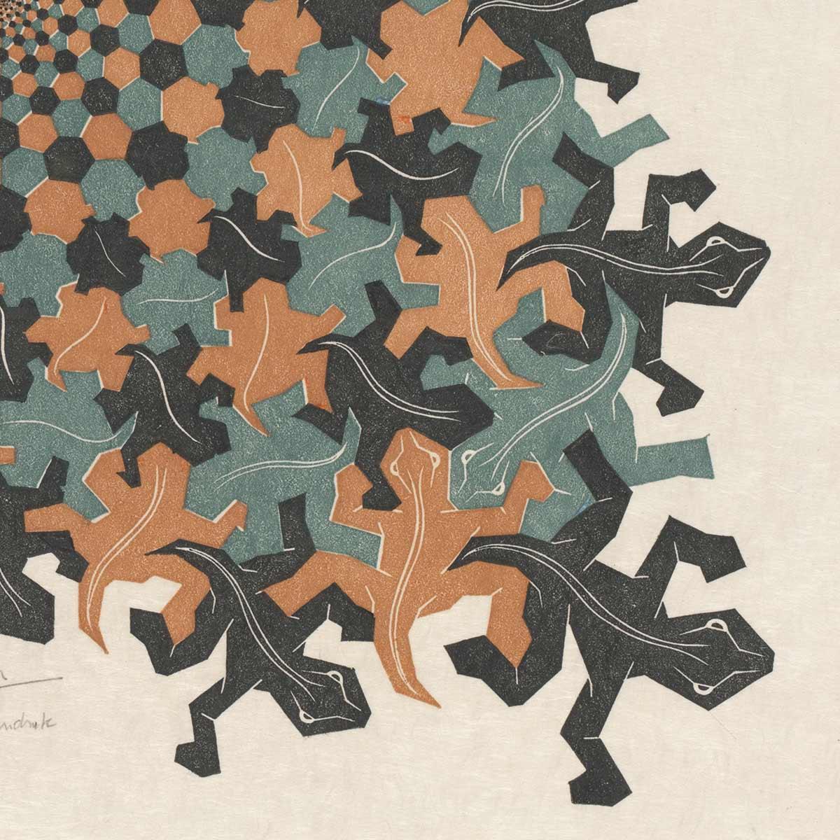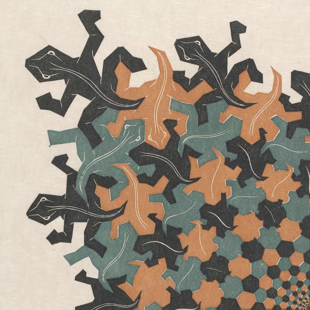 Development II is a woodcut from 1939, but a print like Square Limit from 1964 shows that Escher was preoccupied with the illusion of infinity on paper until late in his life. In May 1971 he created Regular Division No. 137, his last tessellation which featured a 'ghost' that could repeat itself indefinitely. Less than a year before his death, the subject still gripped him.
