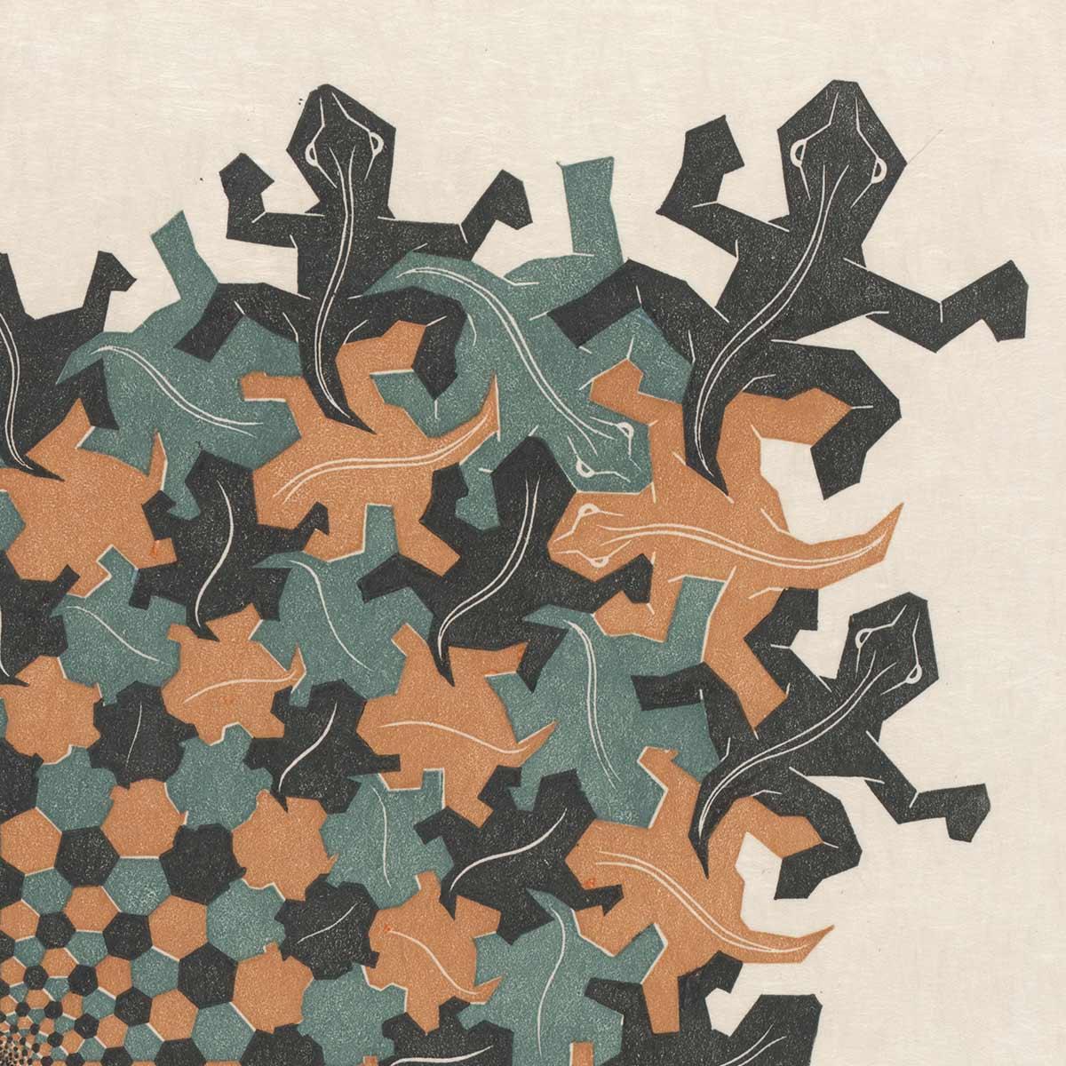 Although Escher was fascinated by the regular division of the plane all his life, he always used his research into this phenomenon as a tool. He never created a tessellation as a stand-alone print. He came closest with the prints in his book The Regular Division of the Plane from 1958. For him, the many drawings featuring tessellations that he created were primarily a starting point for other work. This is clearly visible in his metamorphoses and cycles. Often these concepts coexist in the same print. Consider in this regard early works such as Cycle (1938), Day and Night (1938), Metamorphosis II (1939-1940), Reptiles (1943) and Encounter (1944). These prints feature a regular division of the plane, a metamorphosis and a cycle all at once. They are each part of the story he wants to tell. A story that is 'finished' because it forms a cycle. But there are also prints in which he tries to capture infinity without resorting to narrative, i.e. by means of a regular division of the plane and sometimes a metamorphosis, but without a cycle. In those prints he suggests that the image can go on indefinitely, even though the edges of the paper prevent continuation. An early example of this is Development II, from February 1939.