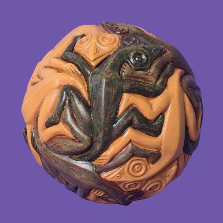 The sphere measures 14 centimeters in diameter. The rich oeuvre of graphic artist M.C. Escher features only three of them: one with fish, one with human figures and one with lizards (see photo). It is a magnificent object, but definitely not one intended to be used as a stress ball.