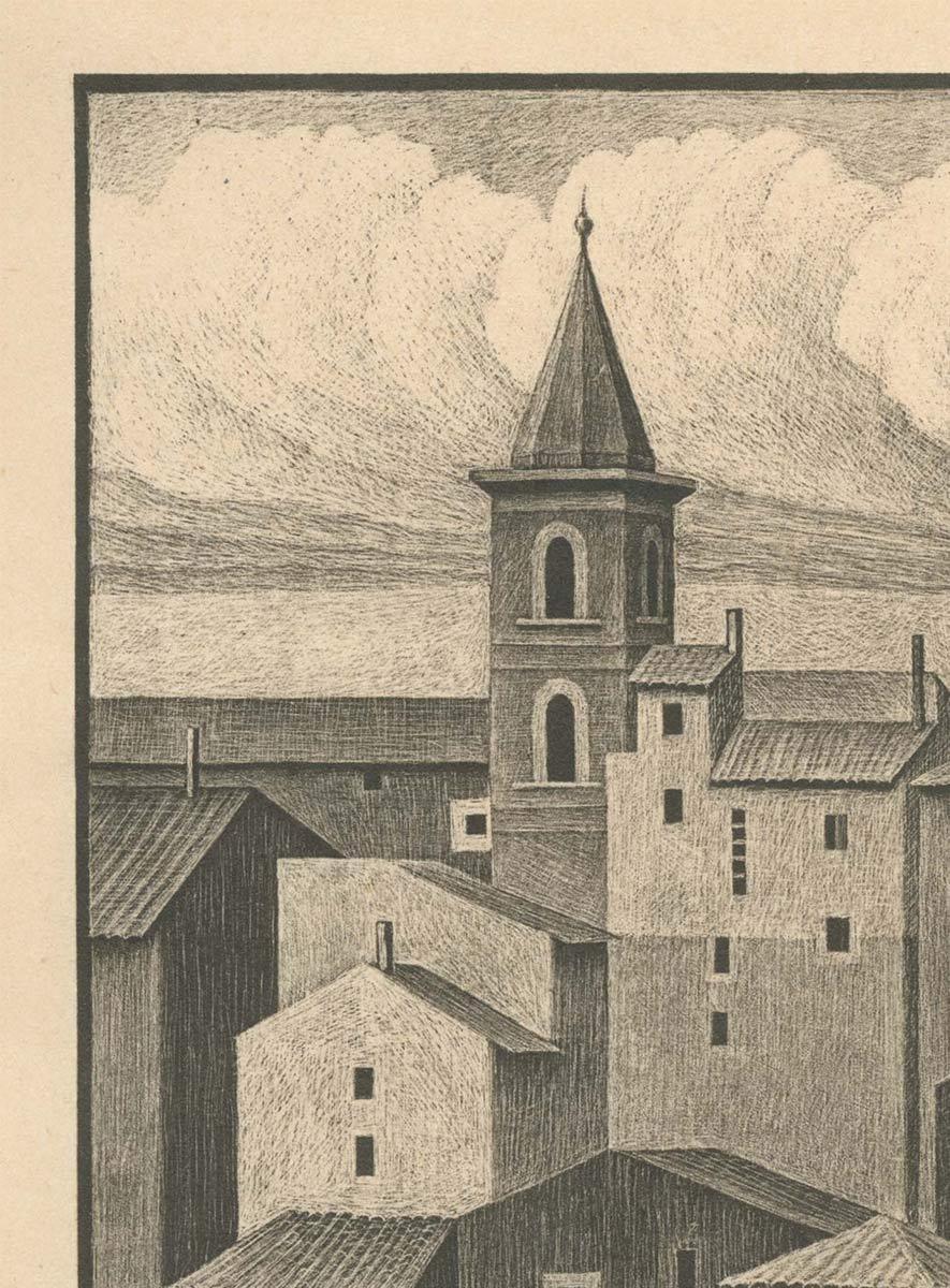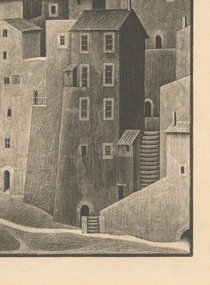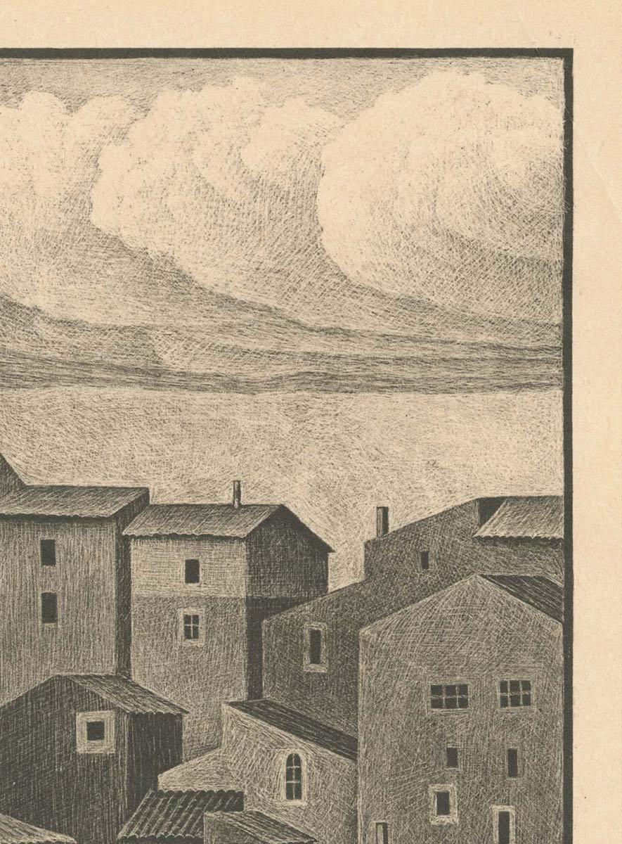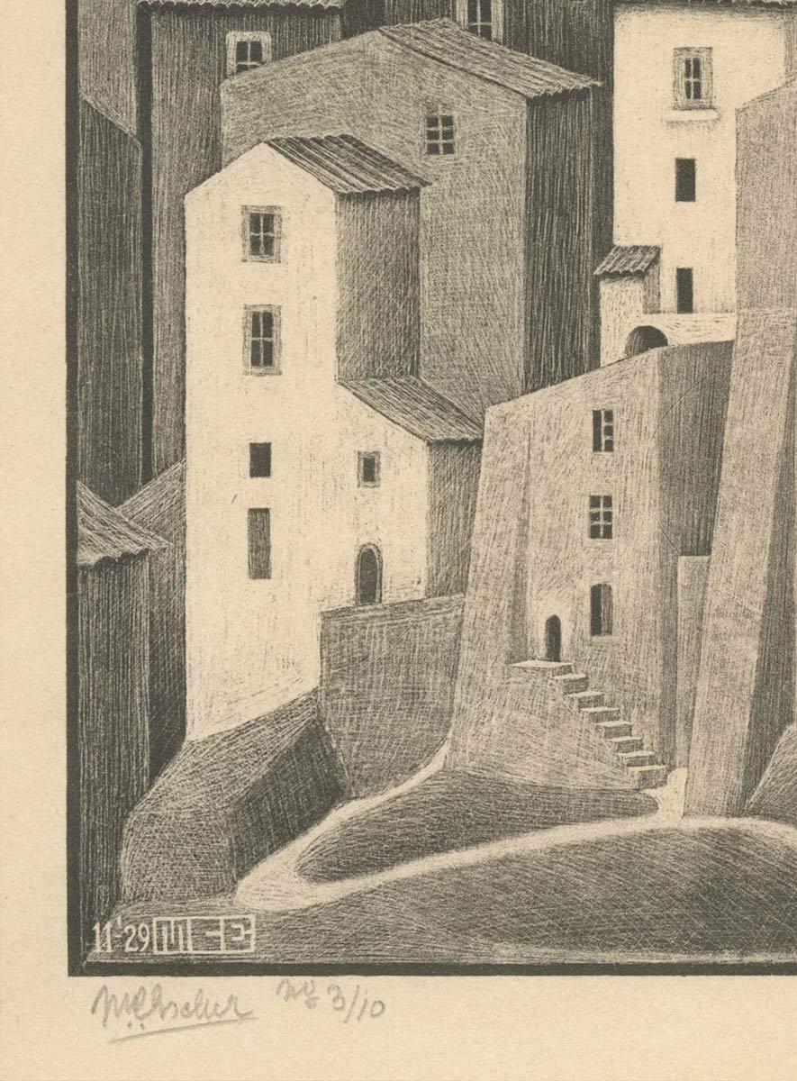 Escher's approach to depicting Genazzano is different to that used in Goriano, Sicoli (also from 1929), Morano (1930) or Santa Severina (1931). Whereas he captures these places from a distance, in Genazzano he chooses to zoom in. The differences in elevation within the town become clear, but as a viewer you get nothing of the context. The result is a linear print in which the houses rise almost like residential blocks. A plethora of windows make the lithograph reminiscent of Montecelio's large stencil drawing from 1924.