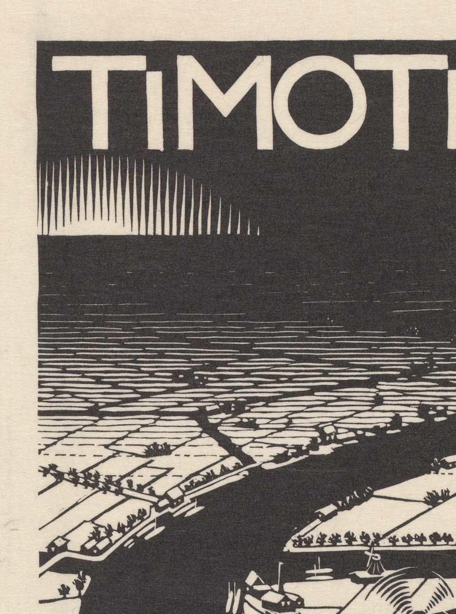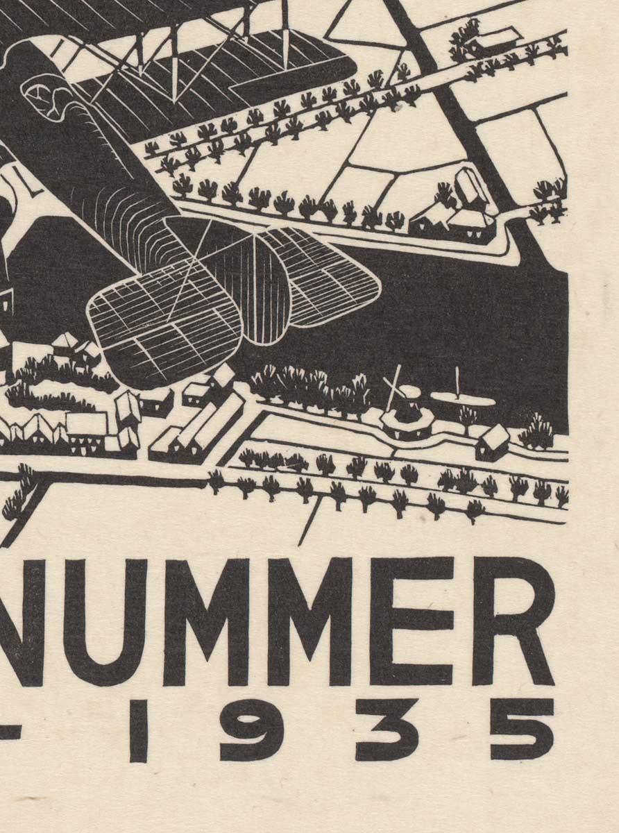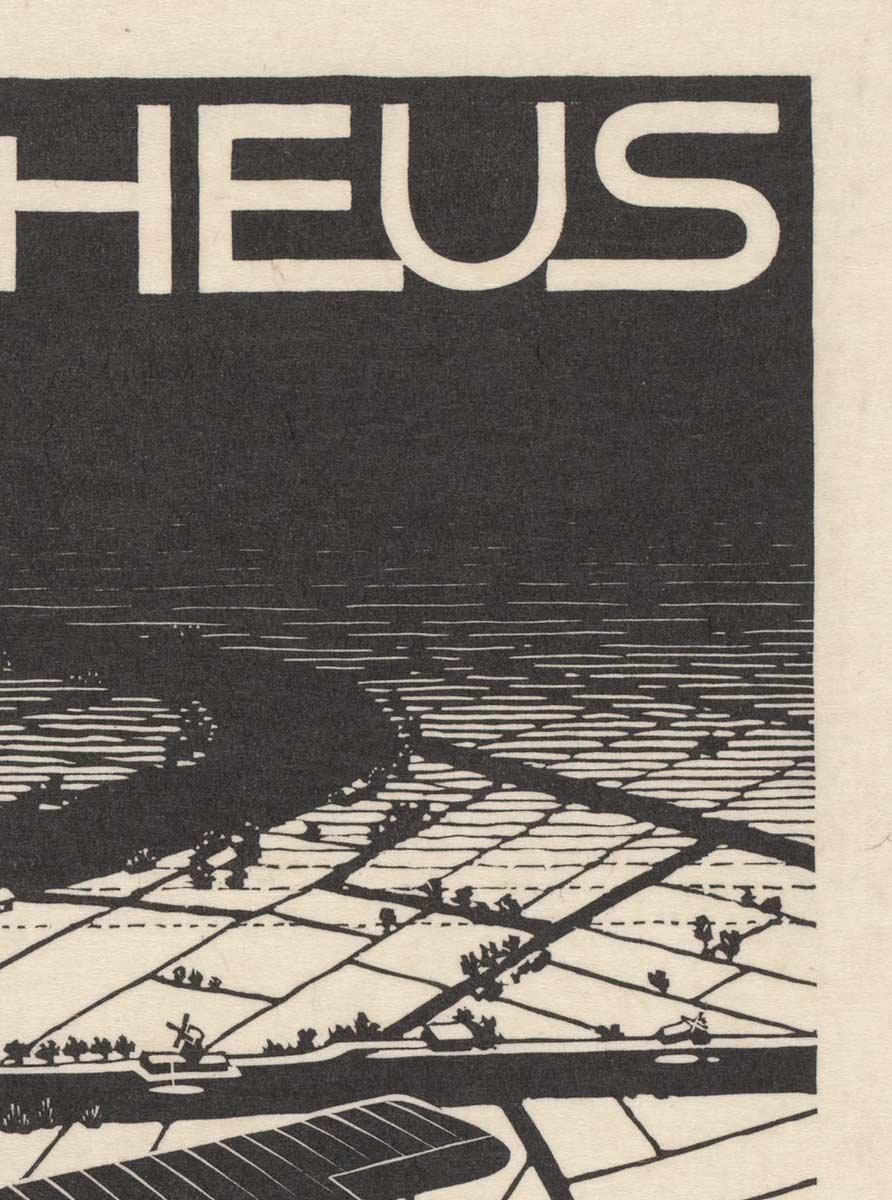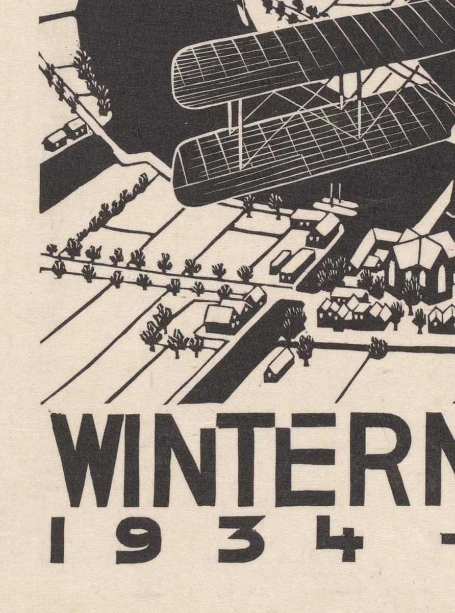 Behold this print, an aeroplane above a snowy landscape. A patchwork of lots, cut through by a river. He would return to this theme in his famous print Day and Night.