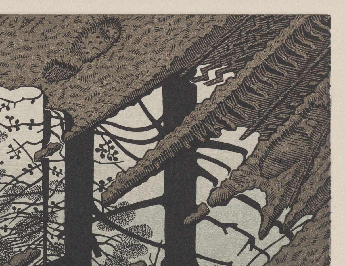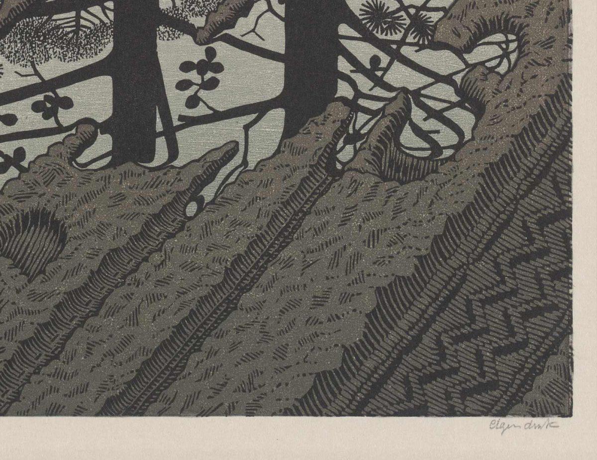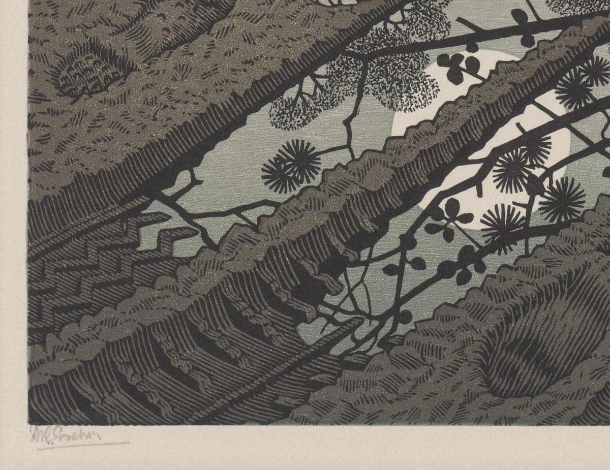 The improbable beauty of the silver glow of the full moon on a cloudless night is achieved by using a very light green for the sky. It is the type of green that seems grey to the untrained eye. In it, a perfectly round moon is cut. The branches of the Corsican pine can be seen reflected in the puddle. A tree that he probably had not found in the Baarn forests, but in a different place. The same trees can be seen in his print Pineta of Calvi. They are typical of the Corsican landscape that Escher had crossed several times.