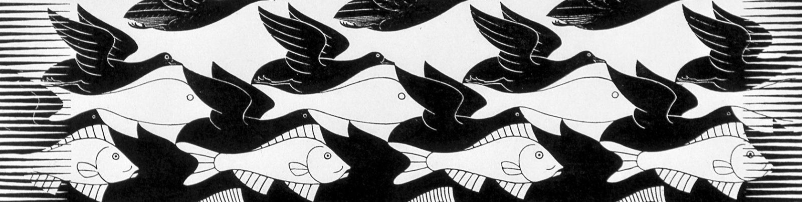 As is often the case with Escher, Sky and water is a simple and yet complex story. Let’s start by taking a look at the first version of it - the square woodcut. So, what exactly is happening in this print? My natural inclination is to view the print vertically, from the bottom up, i.e. from the water to the sky. However, the title suggests otherwise - we ought to look down from the sky onto the water. Whichever way we look at it, a transformation is taking place, a change is occurring in front of our very eyes. And yet, it takes some time before we actually see what is happening.