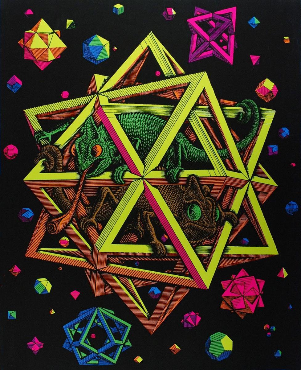 One taboo the hippies liberated themselves from was the copyright to Escher’s prints. Unintentionally, Escher’s prints suited the hallucinogenic effect of LSD perfectly, which many hippies used. Escher’s prints were embraced by the hippie generation and numerous reprints were published with fluorescent colours and fitting new names. The print Dream became Bad trip and Three spheres became Peace on earth. Escher wasn’t too disturbed about the reprints as he could have been. When an American friend advised him to call in a lawyer, he wrote: