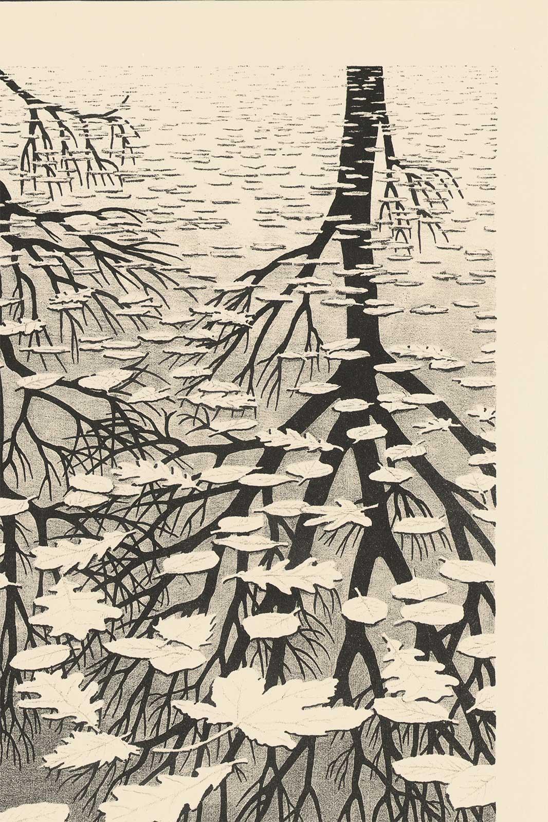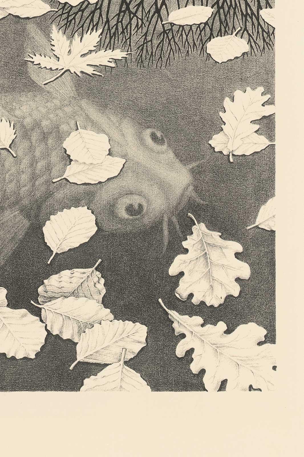 However simple this lithograph might first appear, it is of course anything but. Three Worlds is the result of an extensive thought process, many sketches and a masterful control of the craft. Escher drew the fish several times, rotating it in different ways until he was satisfied. It is an imagined fish resembling a Japanese ornamental carp. You will not find them in puddles in the forest. Escher was searching for an archetype, a fish that is immediately recognisable as ‘fish’ and as a denizen of this world under the water’s surface. In that regard, the trees — which are beyond our field of vision yet still show up within it — were simpler. Escher shows their contours without leaves and without recognisable details. These too are archetypes. The leaves accentuate the water’s surface, a phenomenon he reinforces by giving each leaf a shaded edge that makes them seem to float on the water. They have recently fallen and will eventually disappear into the deep, into the other world.