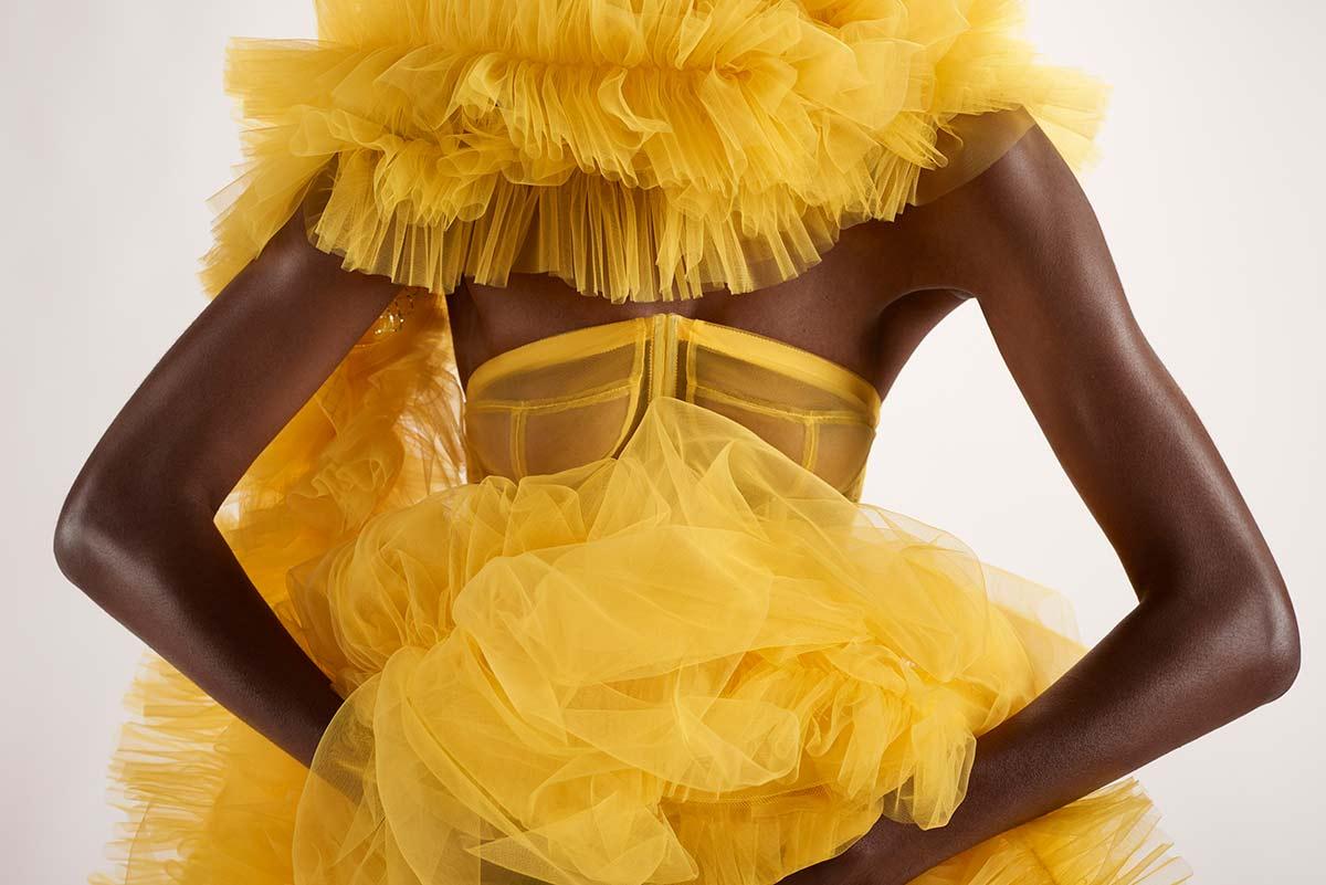 The collection developed by Winklaar is an ode to his homeland, Curaçao. For these colourful garments, he draws inspiration from nature, with the distinctive yellow Kibrahacha tree as a centrepiece. Winklaar has chosen a variety of silhouettes, fabrics and techniques specially for the exhibition. Visitors will experience the weight of a heavy, rough sequin fabric, as well as the lightness of a tulle. A slender evening dress is alternated with the shapes of a voluminous, angular 80s blazer. Thus creating a wide array of sensations for everyone’s fingers to discover.
